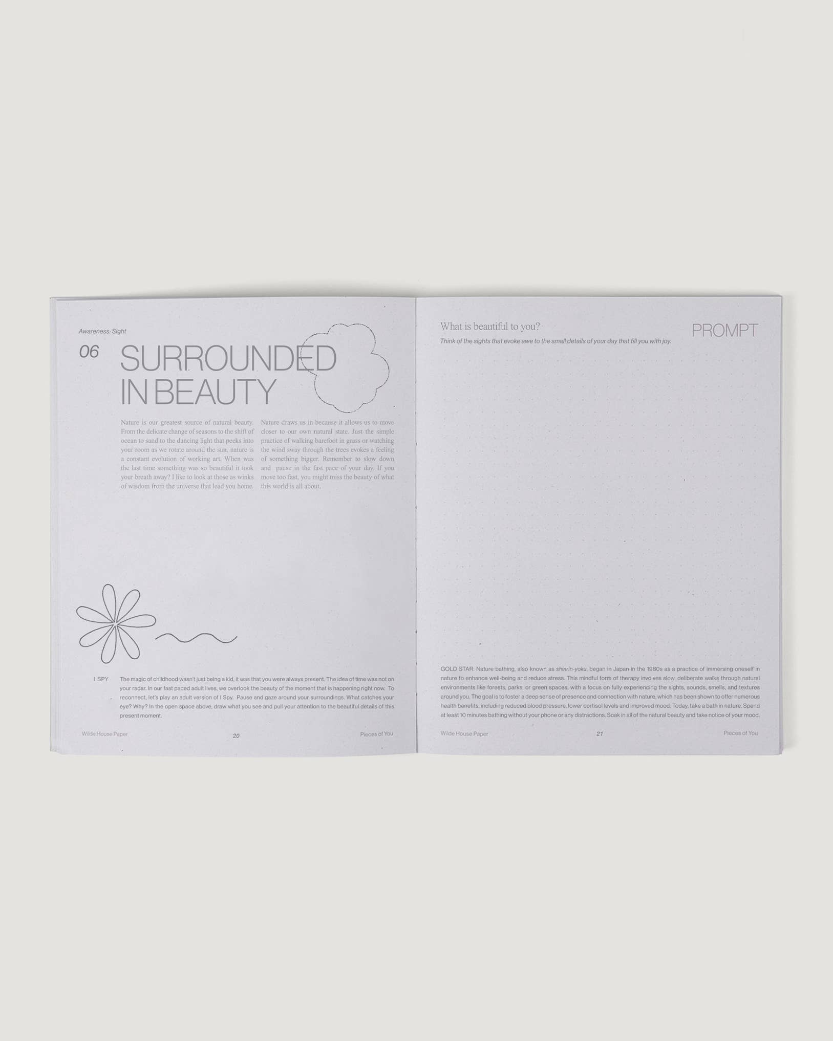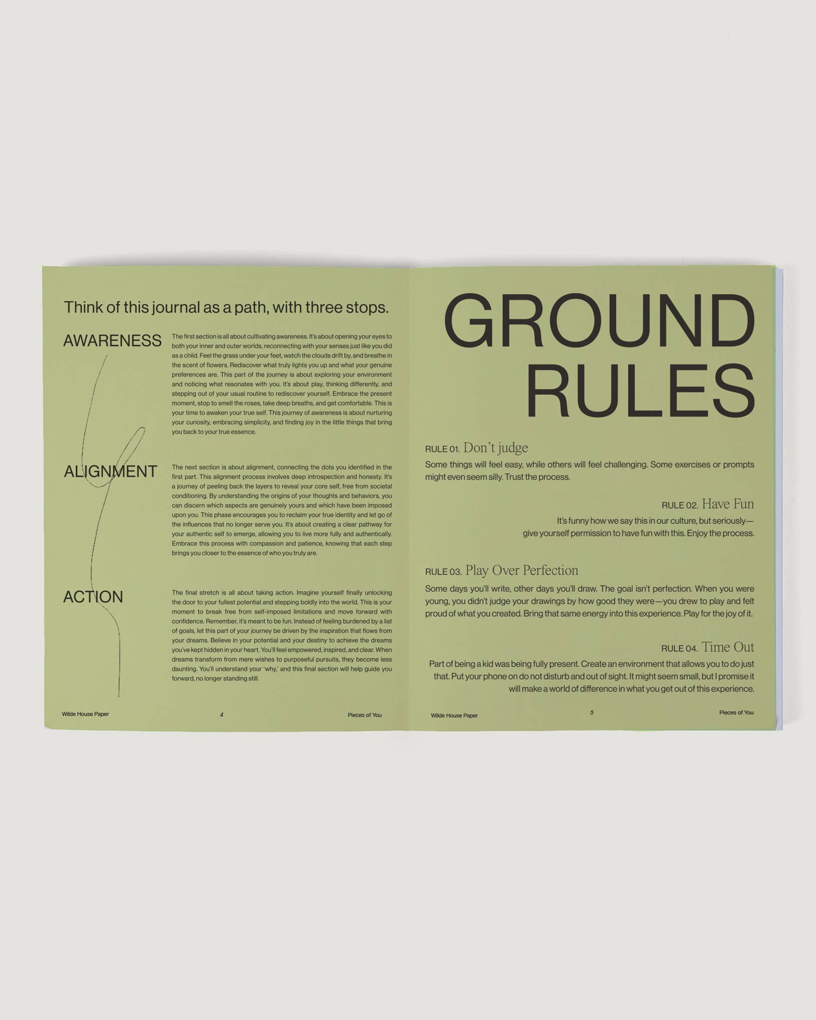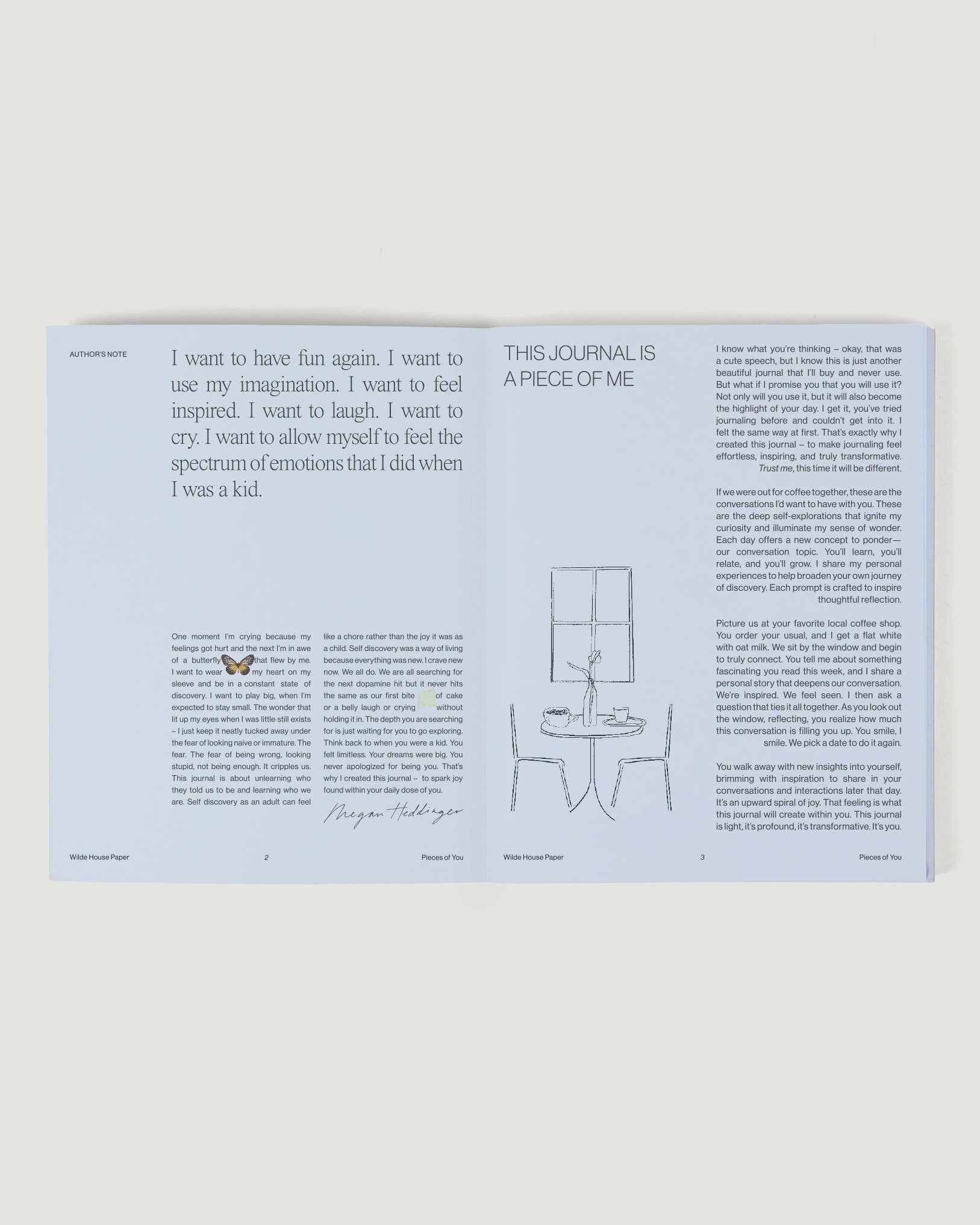 What's Inside? 6 weeks of daily journaling. Consists of three chapters: Awareness, Alignment & Action – Each day is guided by a reimagined childhood theme that includes inspiration, an interactive exercise, a journal prompt, and gold star activity to take into your day. Authored in first person by Wilde House Paper Founder, Megan Heddinger.