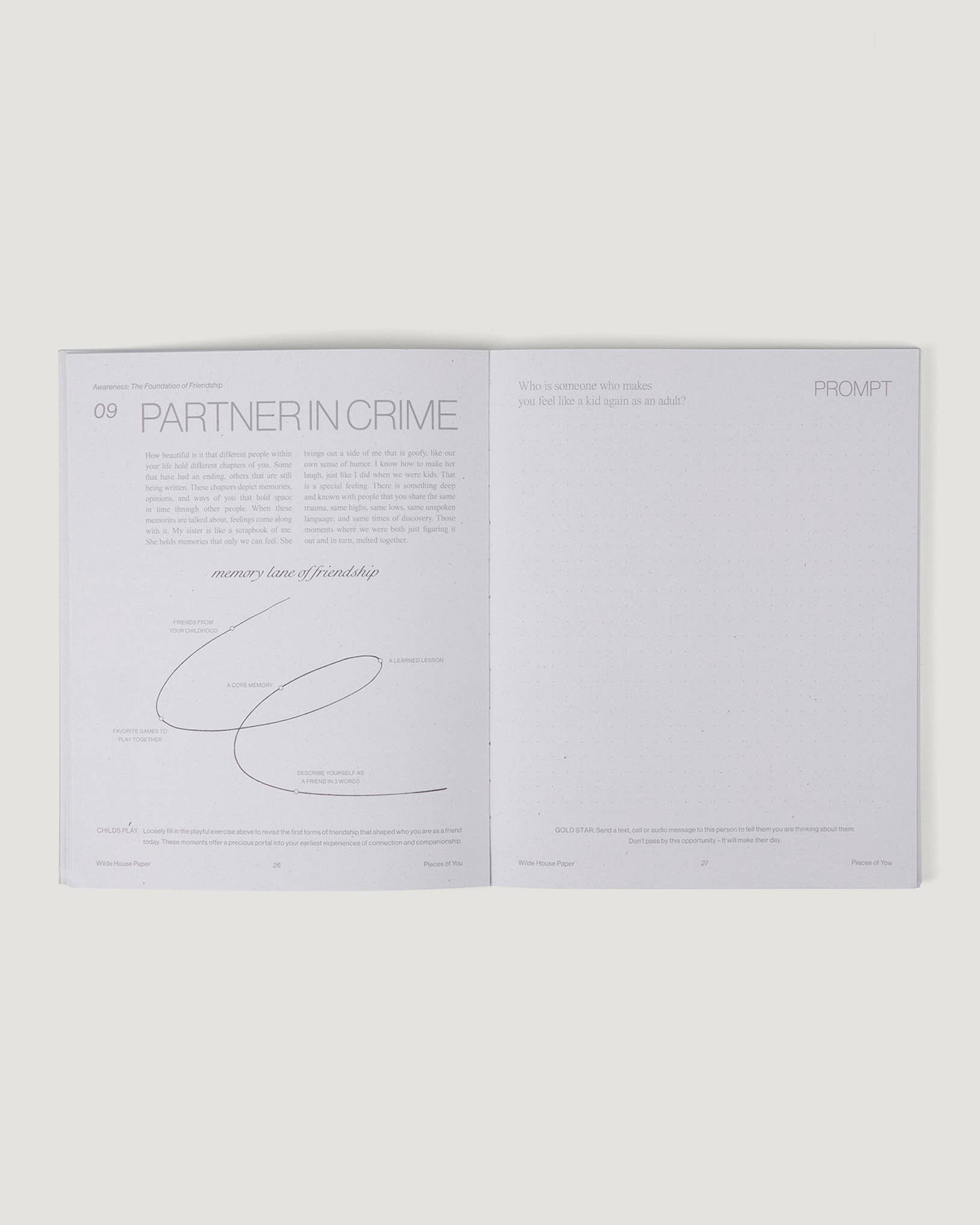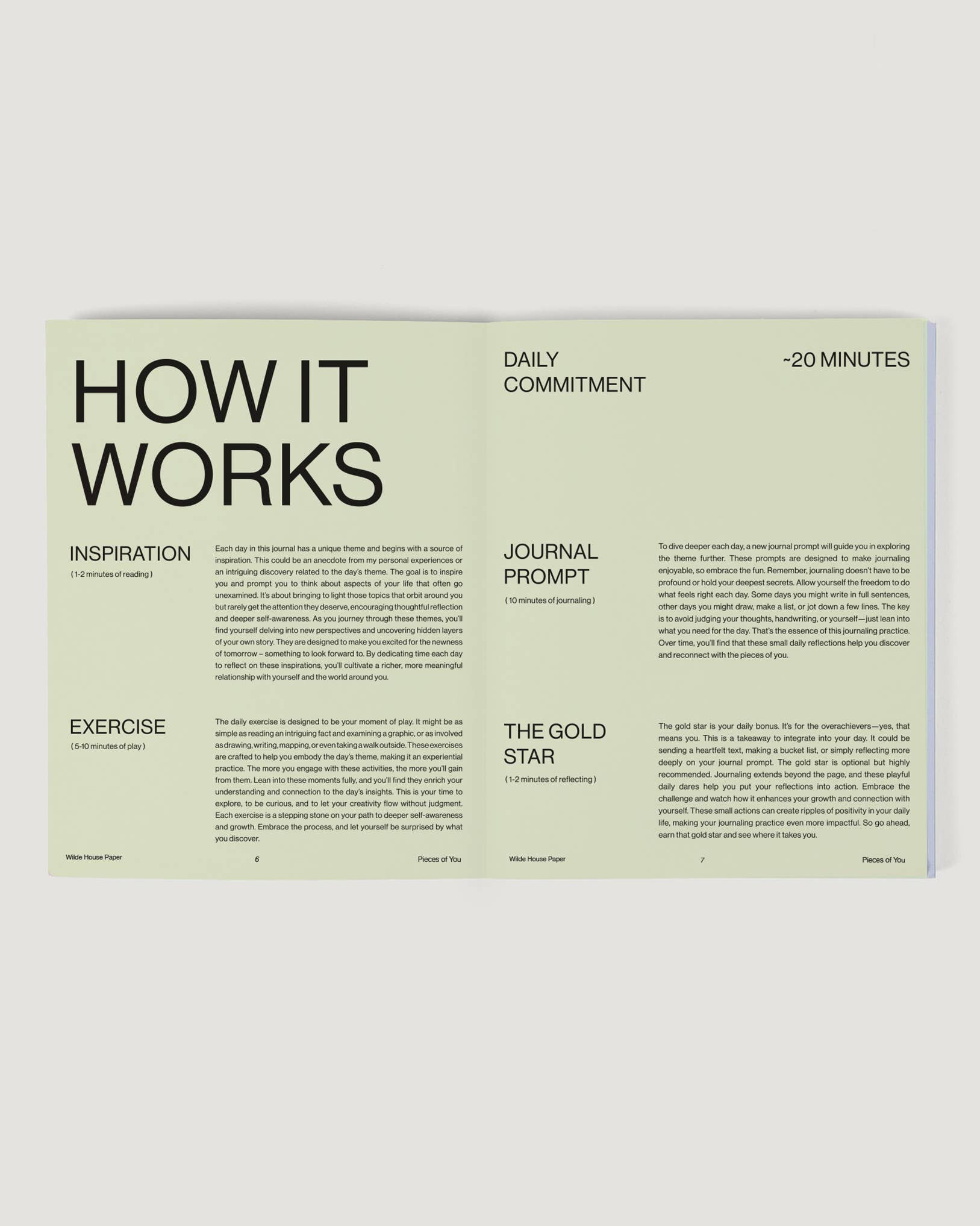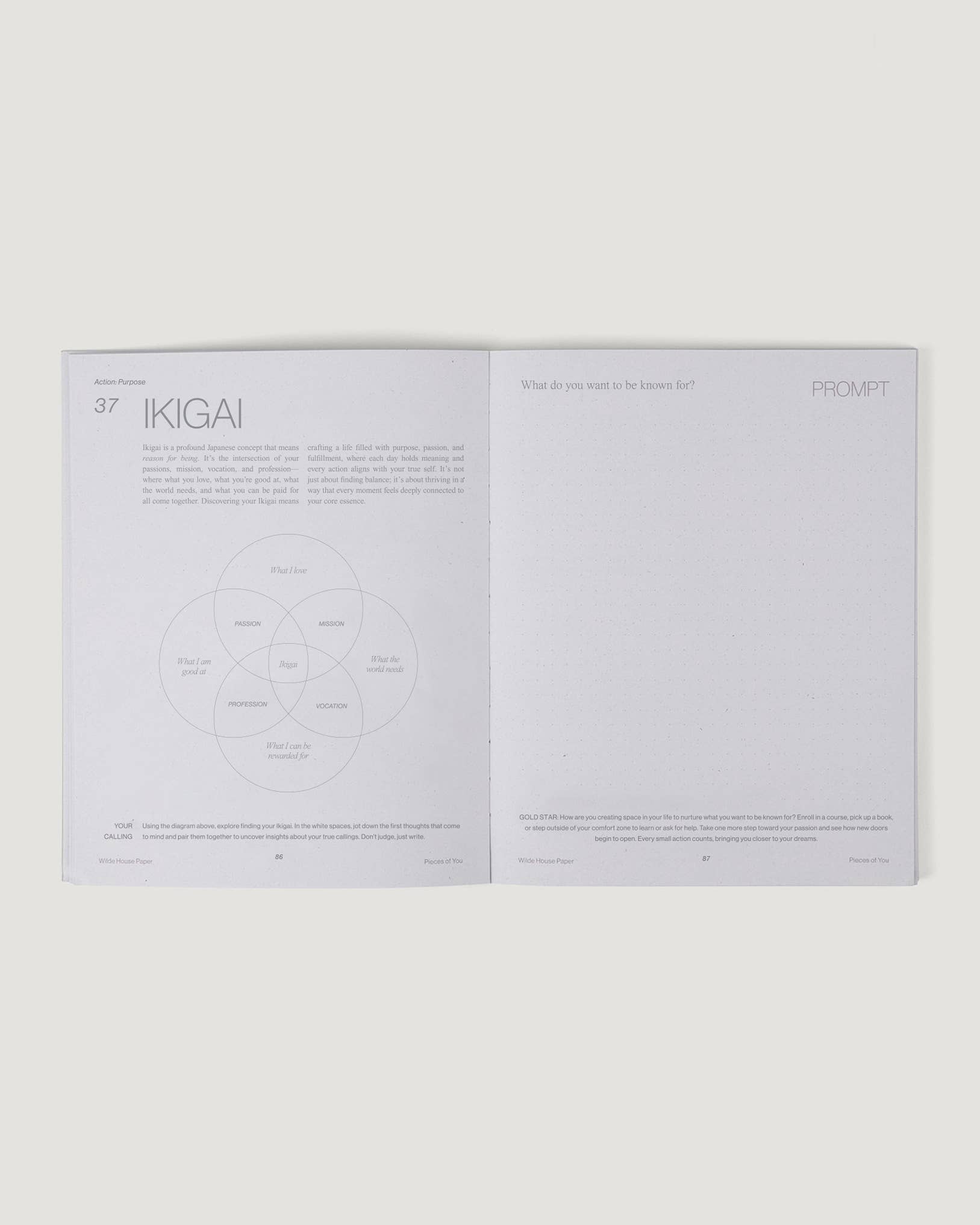 What's Inside? 6 weeks of daily journaling. Consists of three chapters: Awareness, Alignment & Action – Each day is guided by a reimagined childhood theme that includes inspiration, an interactive exercise, a journal prompt, and gold star activity to take into your day. Authored in first person by Wilde House Paper Founder, Megan Heddinger.