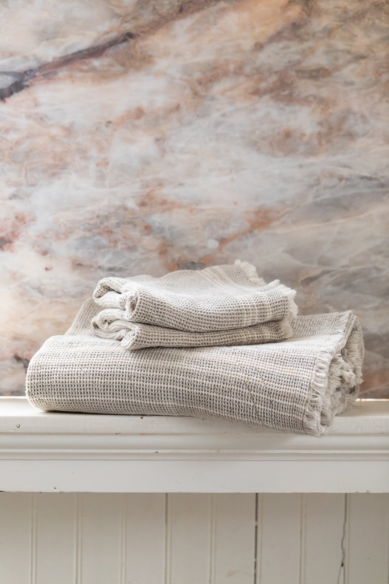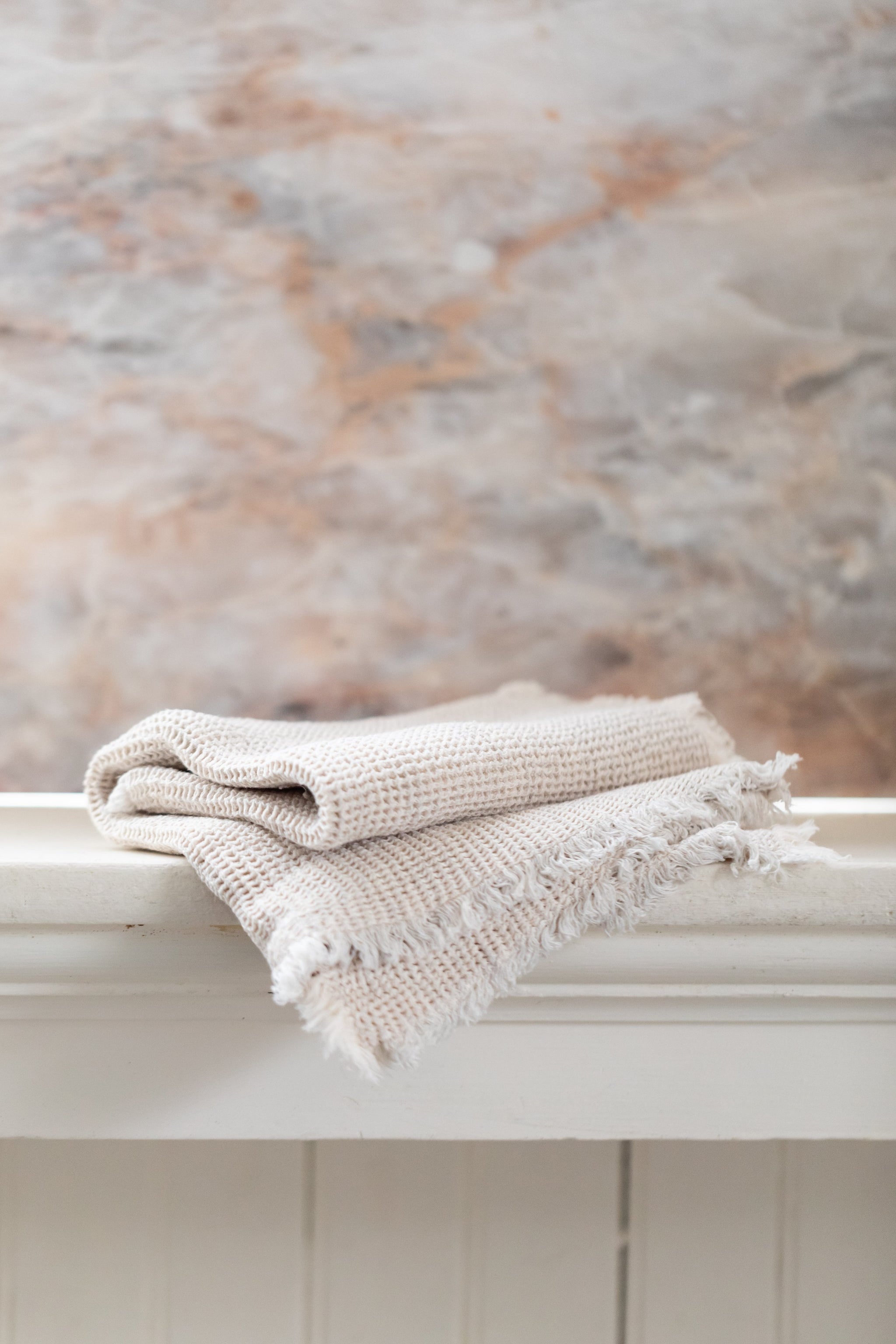 The Fringed Waffle Towel by Lissoy features a rich waffle texture that enhances absorbency while providing a soft, luxurious feel.