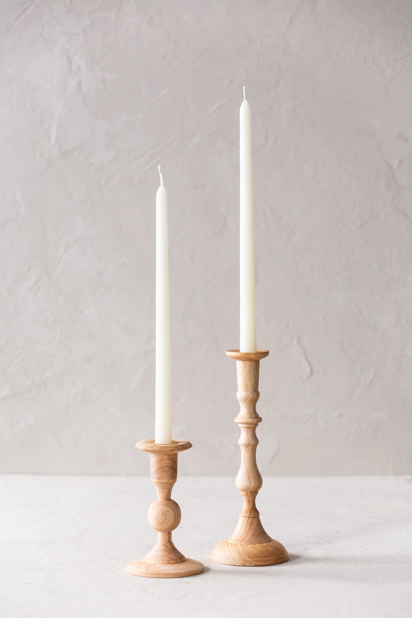 Perfect pairs may have their appeal, but a little variety will always light up the room. These Georgian-inspired candlesticks come in two unique silhouettes of varying heights from hand-carved plantation hardwood. They are most impactful when displayed in conversational clusters on a table, sideboard, or mantle.