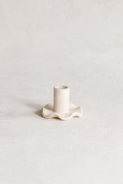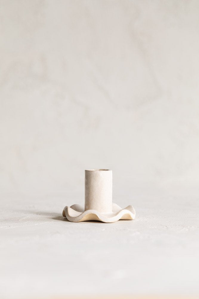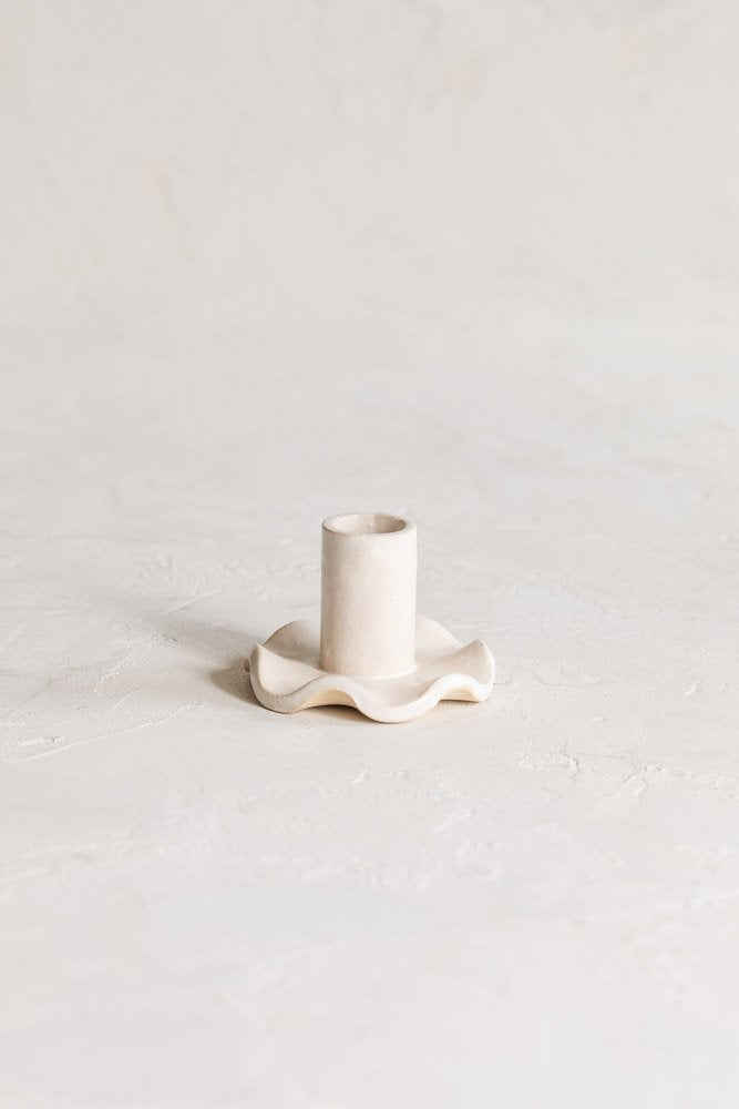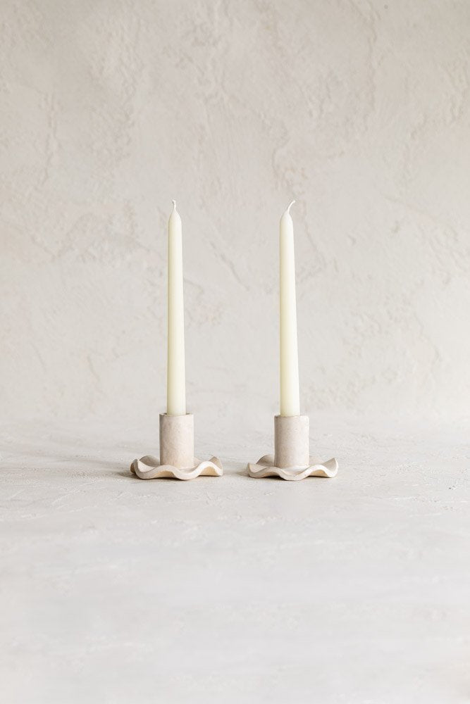 Sweet little candle holders with a ruffled base. Taper candles come in a lot of different sizes, a fatter taper candle will fit best in these.