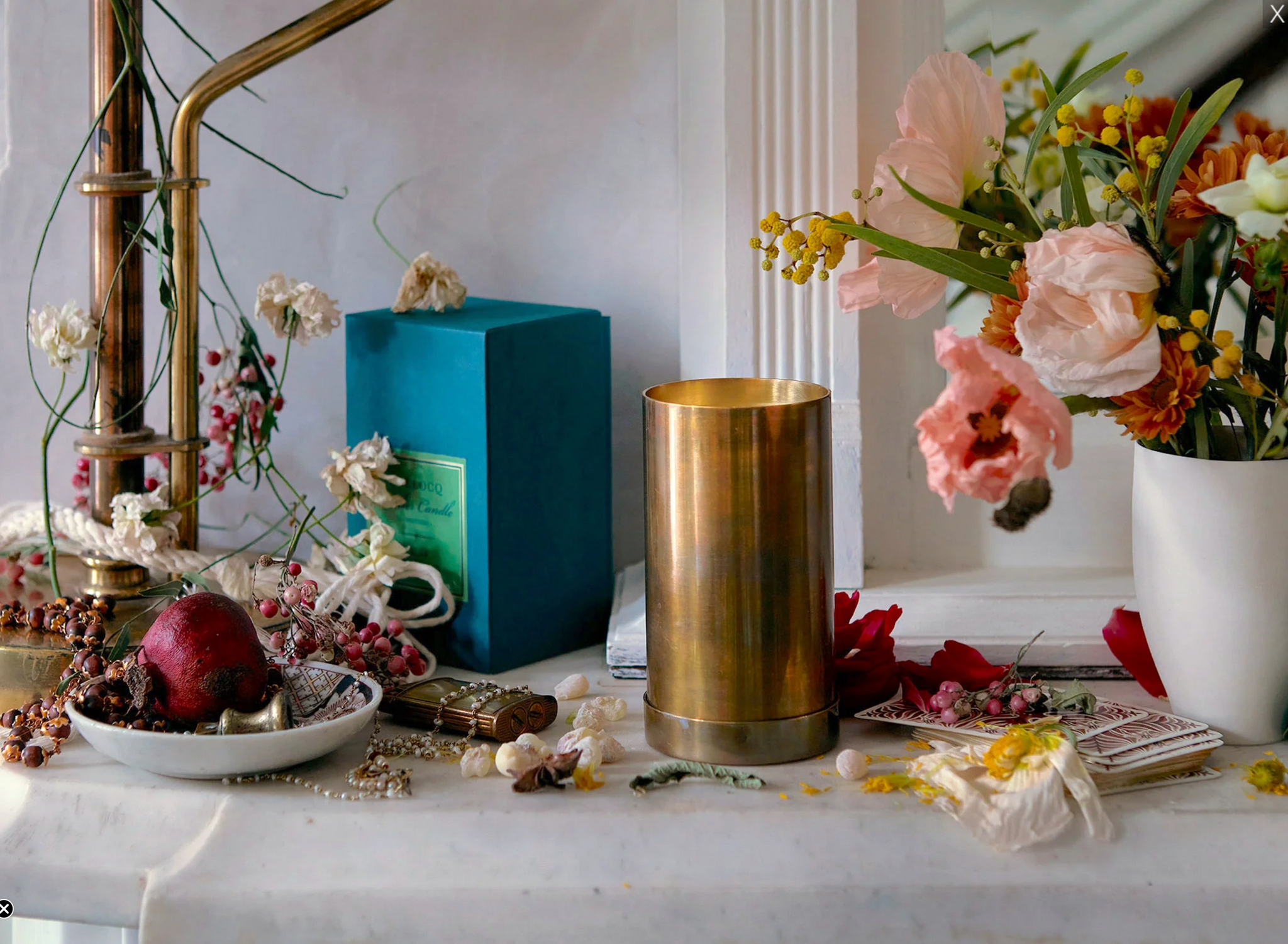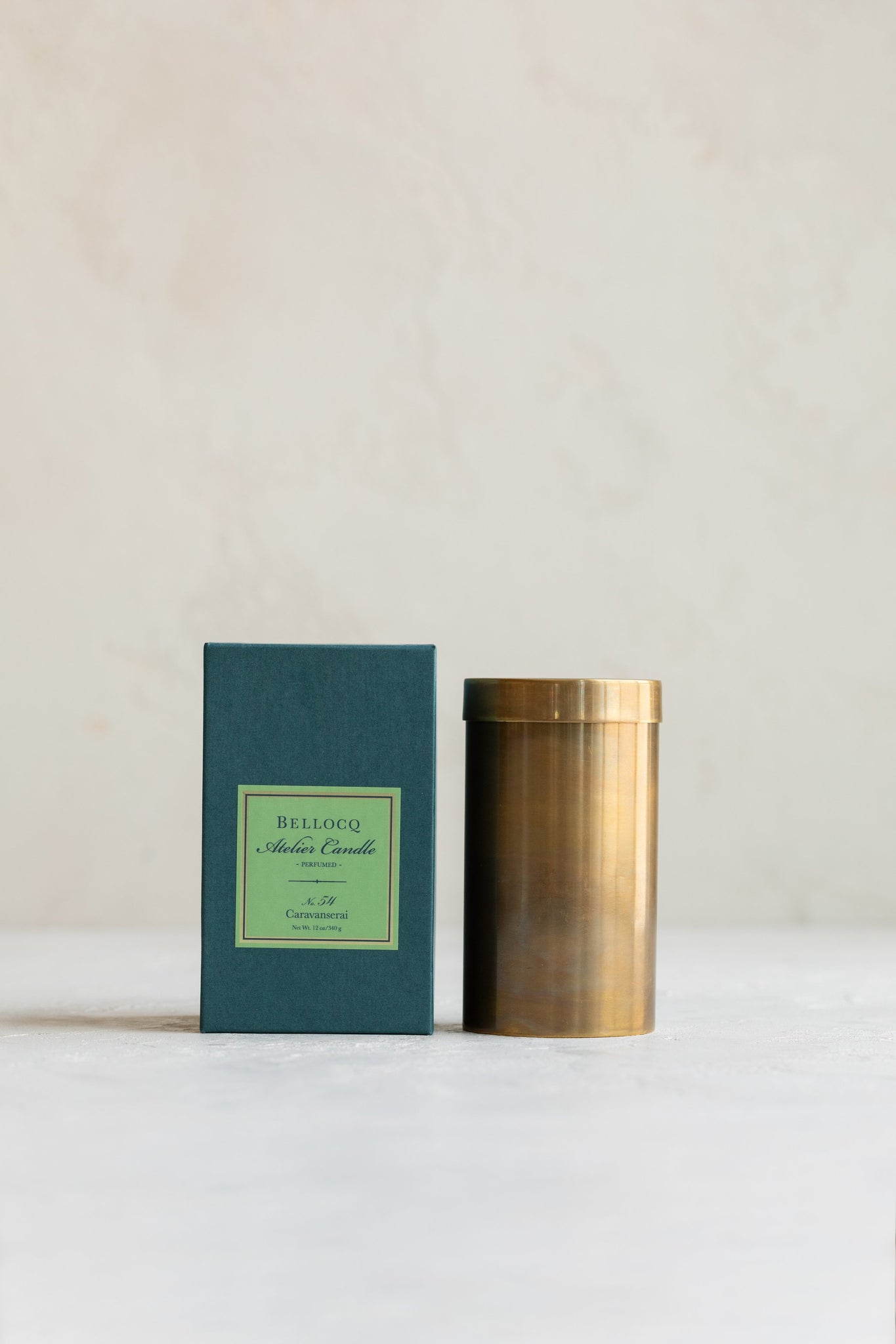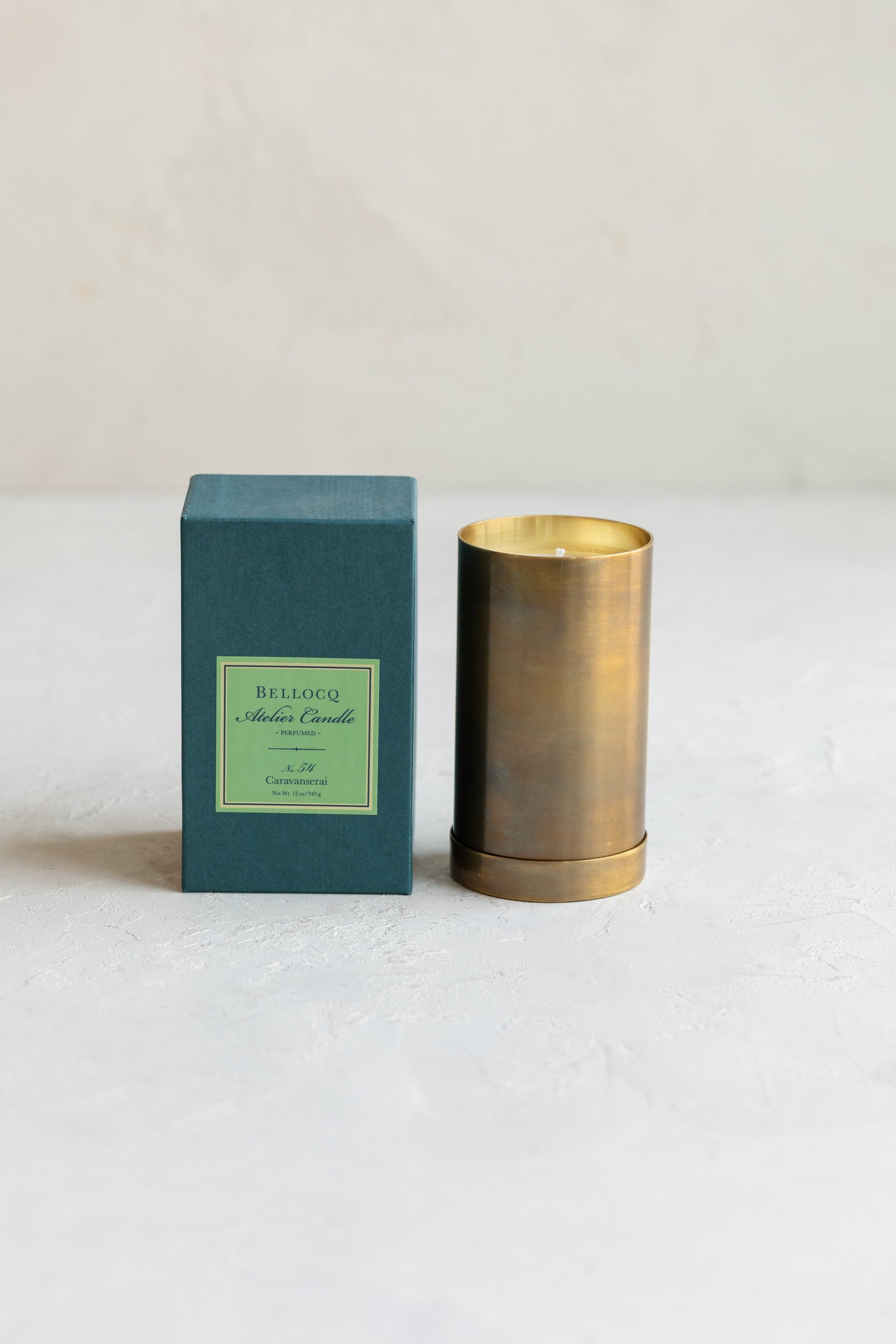 The luxuriously scented brass Atelier Candle, No. 54, Caravanserai is an ode to the wanderer and dreamer in a rich tableau of aged saddle leather, distant campfires, woven burlap satchels of black tea and smoked peppercorn, soulful melodies of longing, and the resinous scent of adventure.