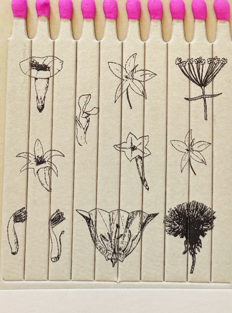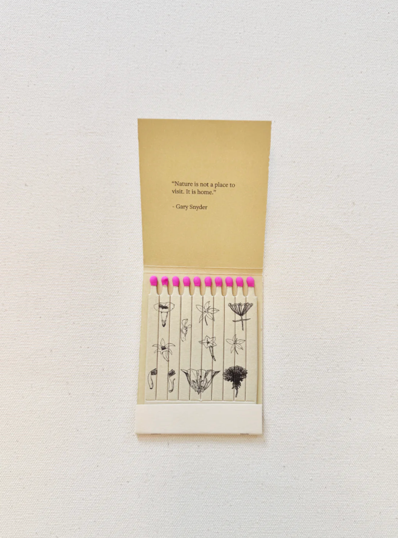 - Large branded botanical matches. Beautiful large scale matches- that have custom green match heads and flowers printed on the match stems. the matches are 3" x 4" closed. Please note the match changes seasonally and made be different from the photo.