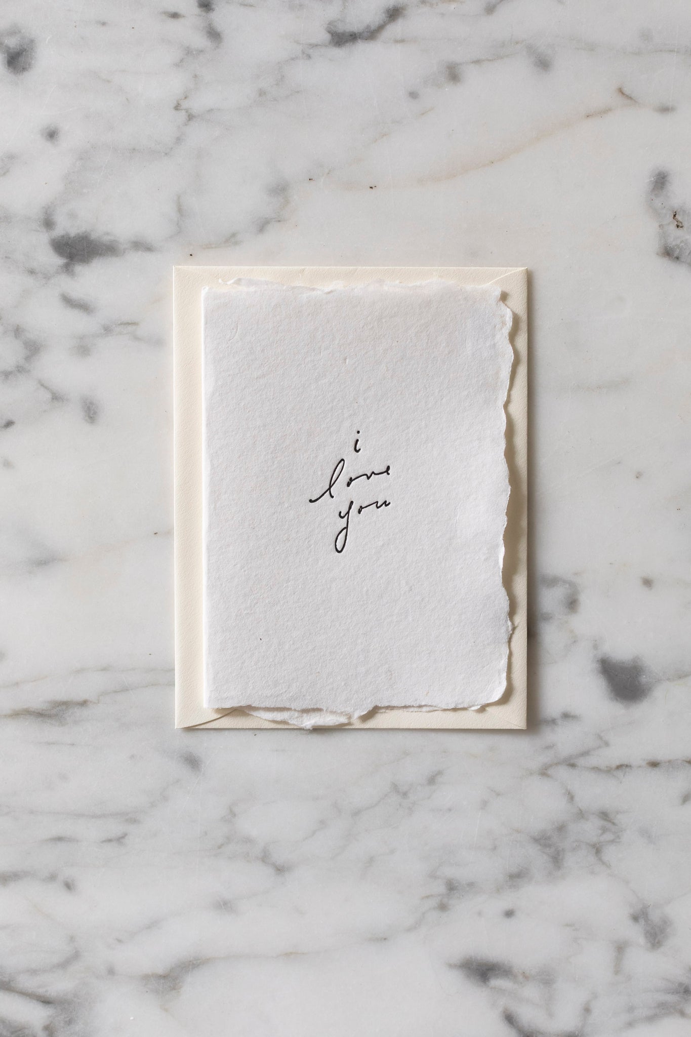 Soft white handmade paper with black letterpress ink. Handmade paper card with four full deckled edges, hand folded with inside blank. Front is letterpress printed; back is letterpress printed with a small note including information about the natural dyes used to color each unique piece of paper.