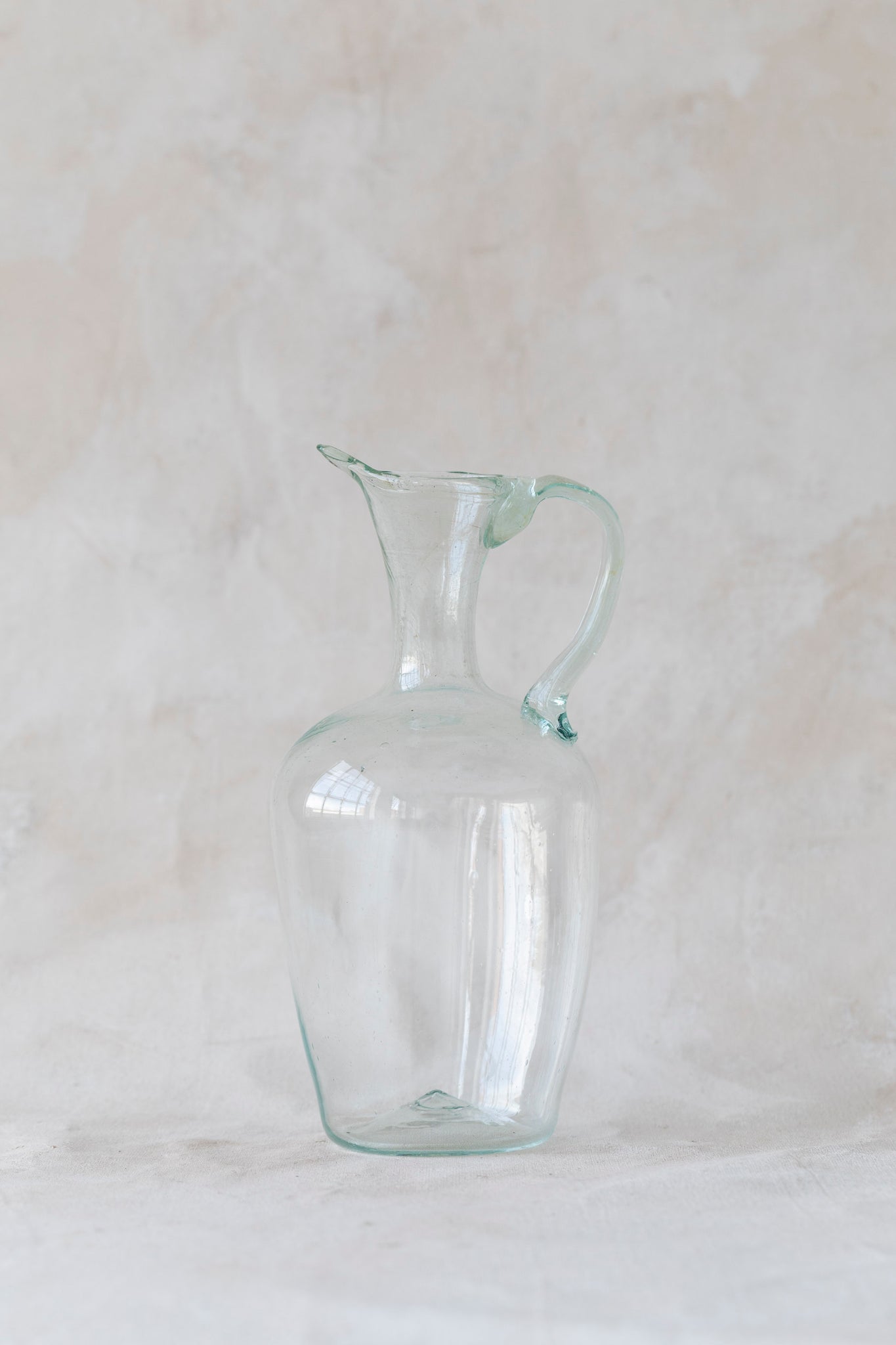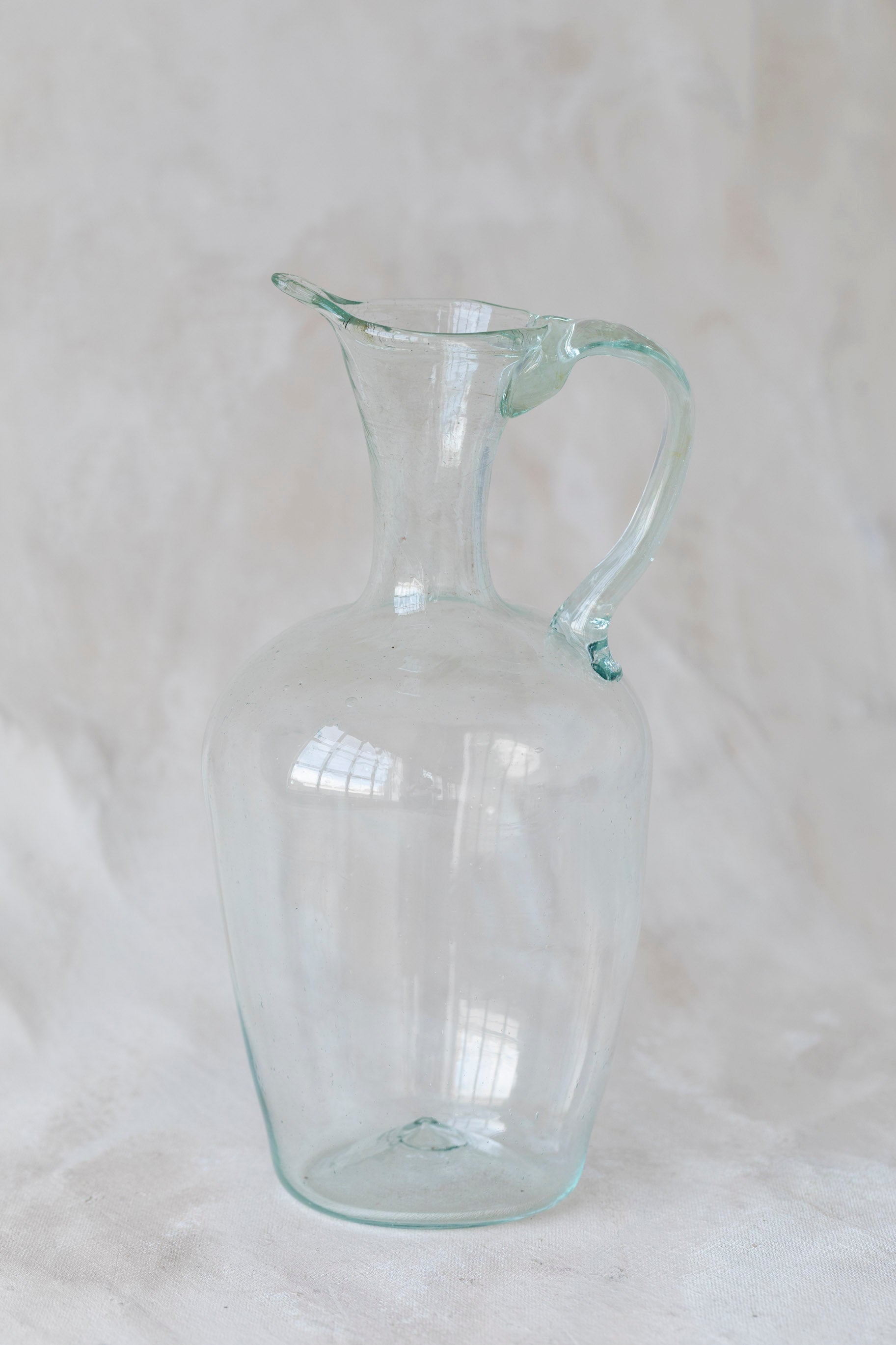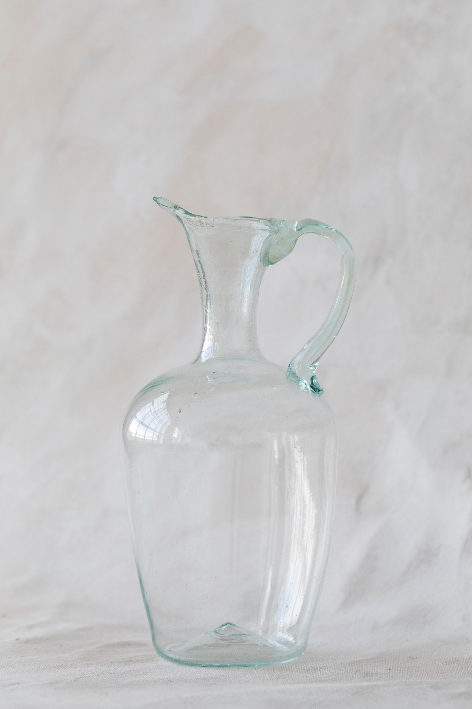 The classic Cruche is a container with a spout and a handle to serve or store liquids. Our version is a very elegant, teardrop-shaped decorative jug with a long lip for pouring. The Cruche is mouth-blown from transparent recycled glass by our master artisan glassblowers.