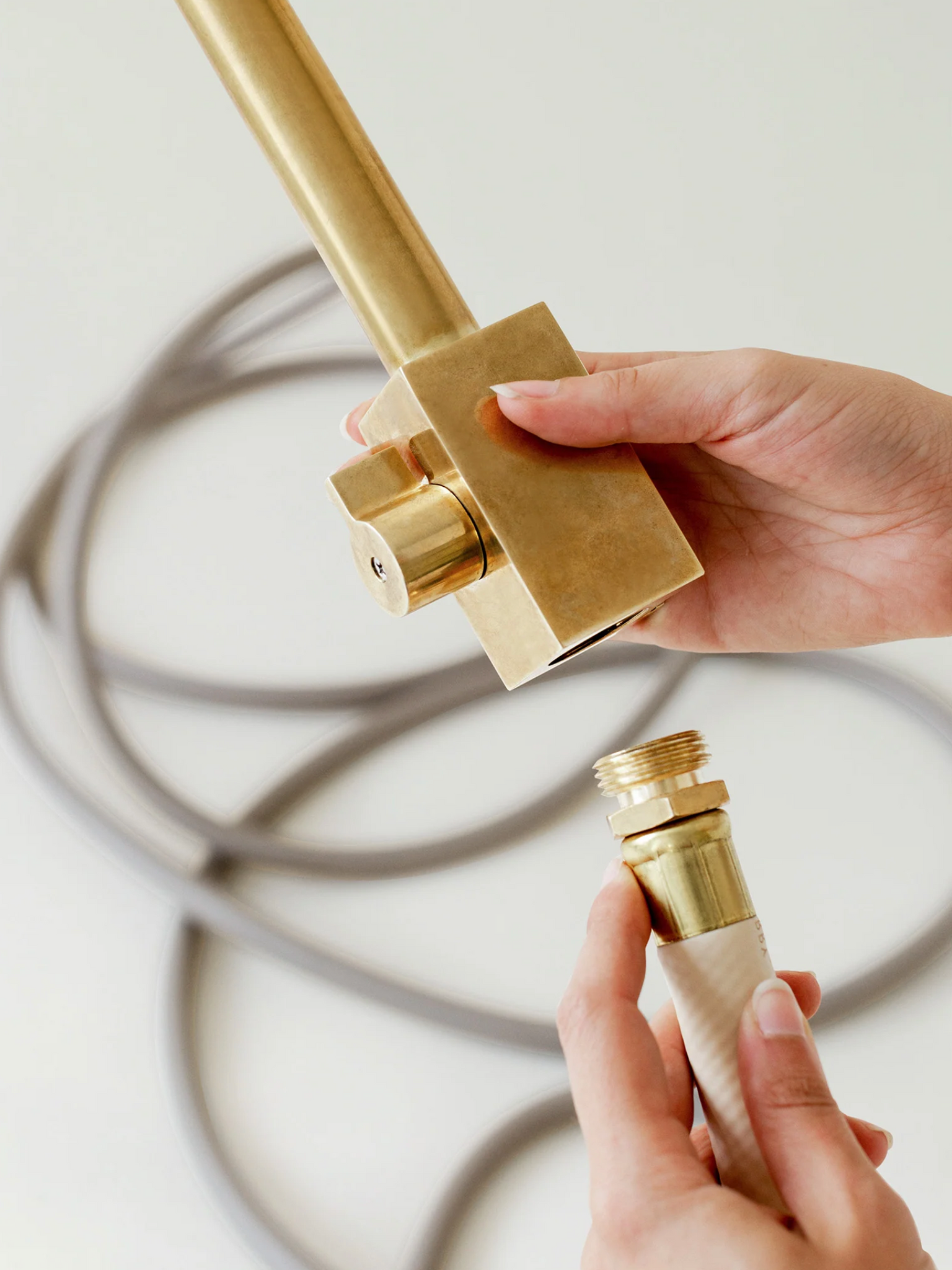 The Brass Outdoor Faucet is an elevated addition to your outdoor experience. Inspired by architect Peter Zumthor’s Therme Vals baths in Switzerland, the Brass Outdoor Faucet emphasizes the beauty of simple, material-forward design. Made from heavy-duty raw brass, the brass faucet can be easily mounted onto almost any surface, and attaches simply to a standard garden hose.