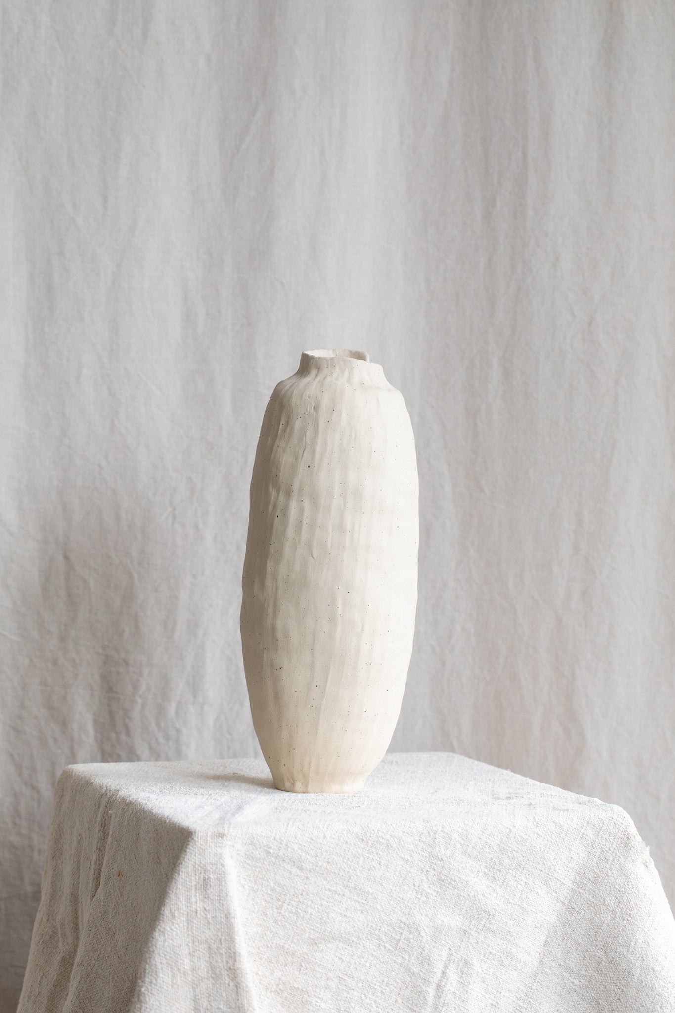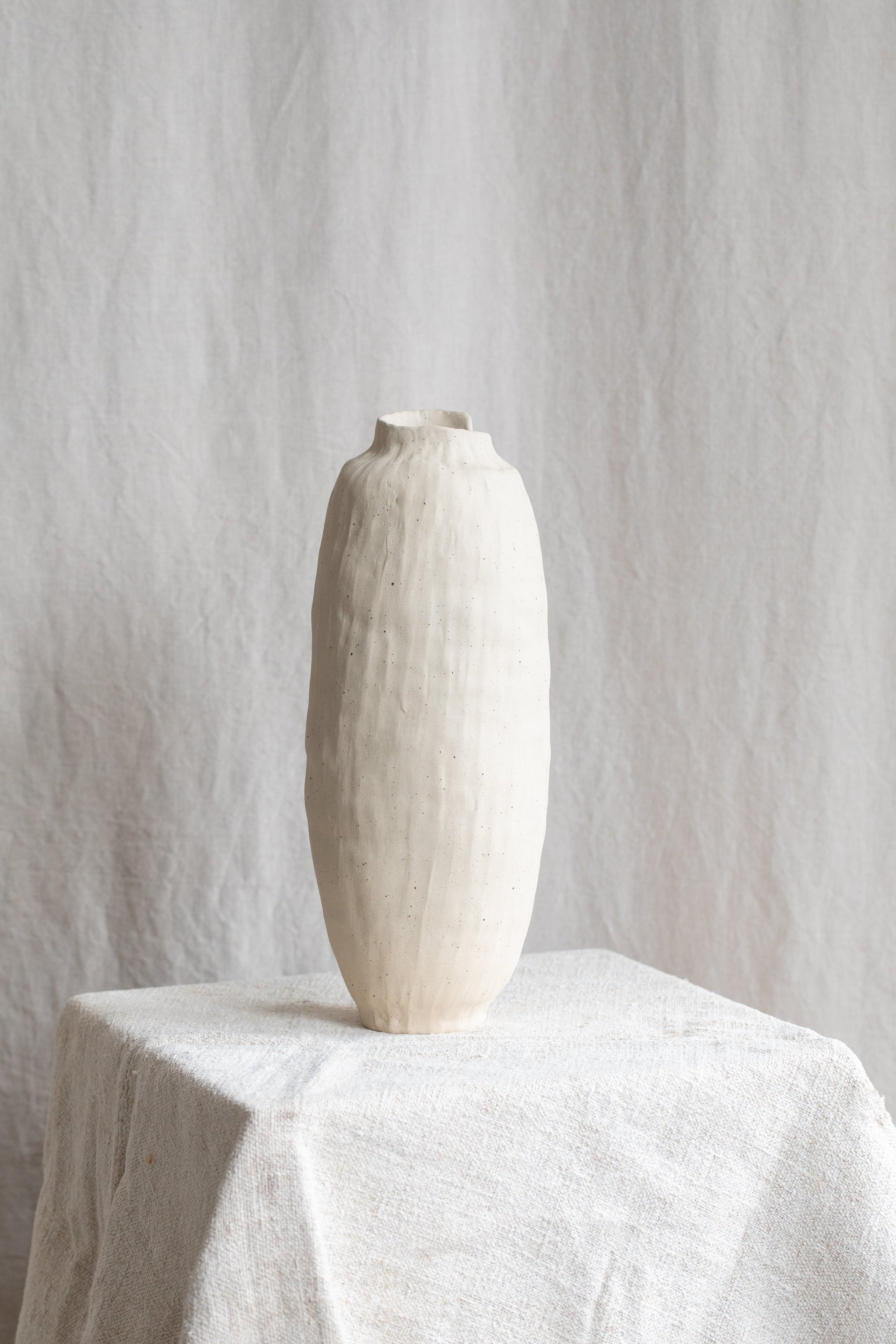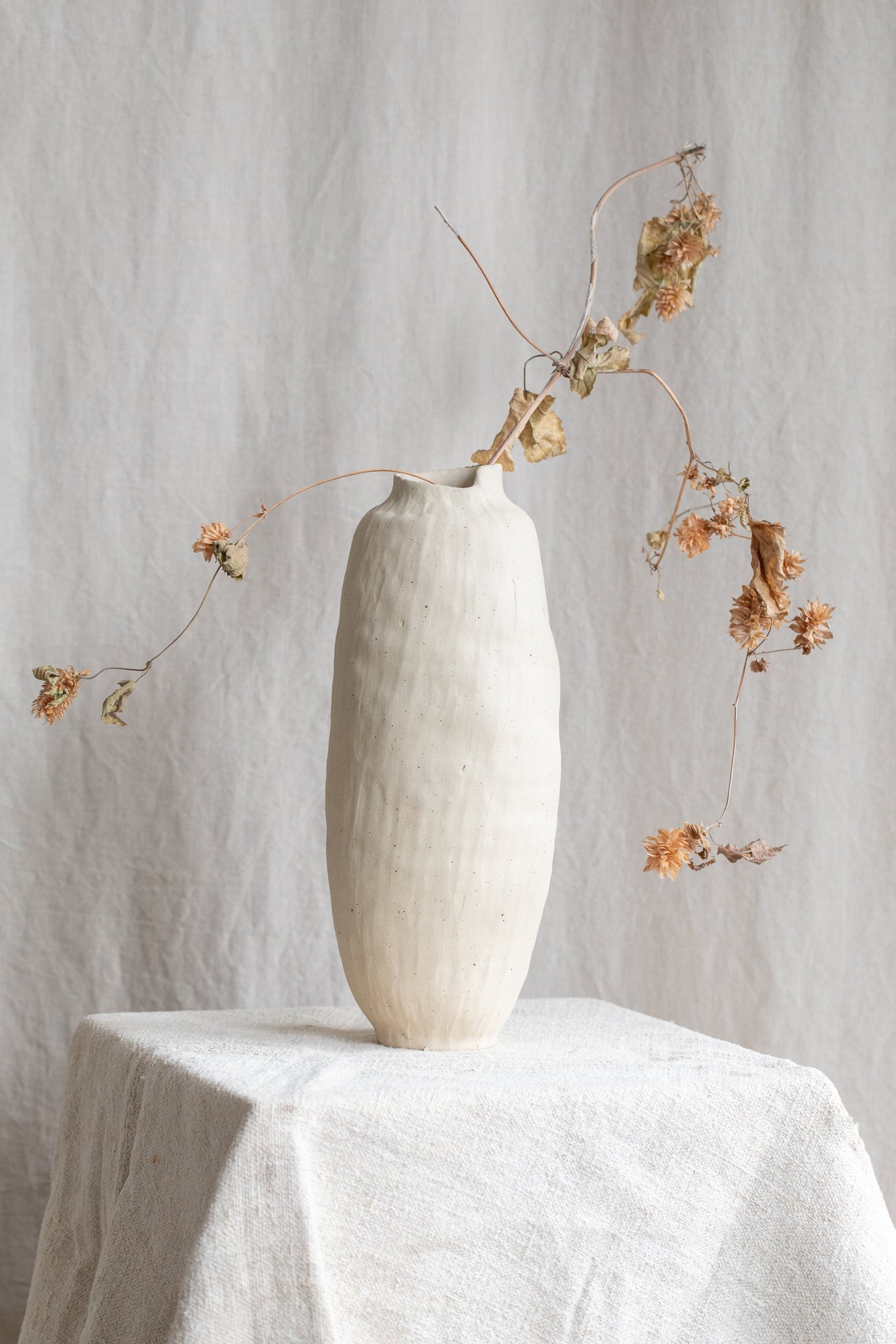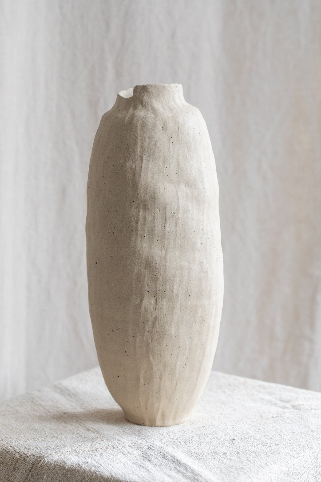 This elevated clay vessel is something that commands attention. This hand-built vessel was made using a hand blended mixture of clays. This piece is left raw and unglazed, highlighting the beauty of the clay. The subtle imperfections give this piece a presence.