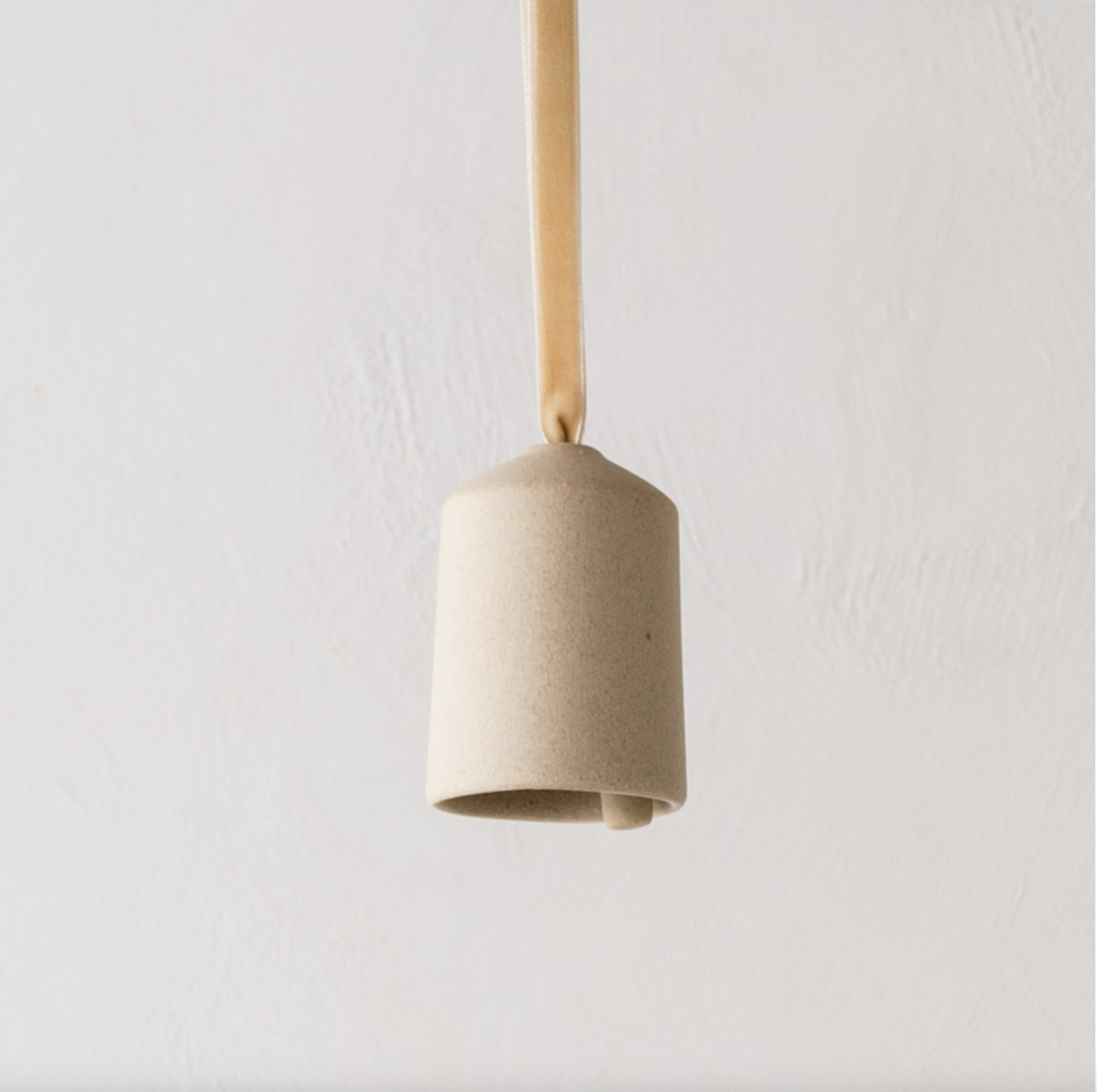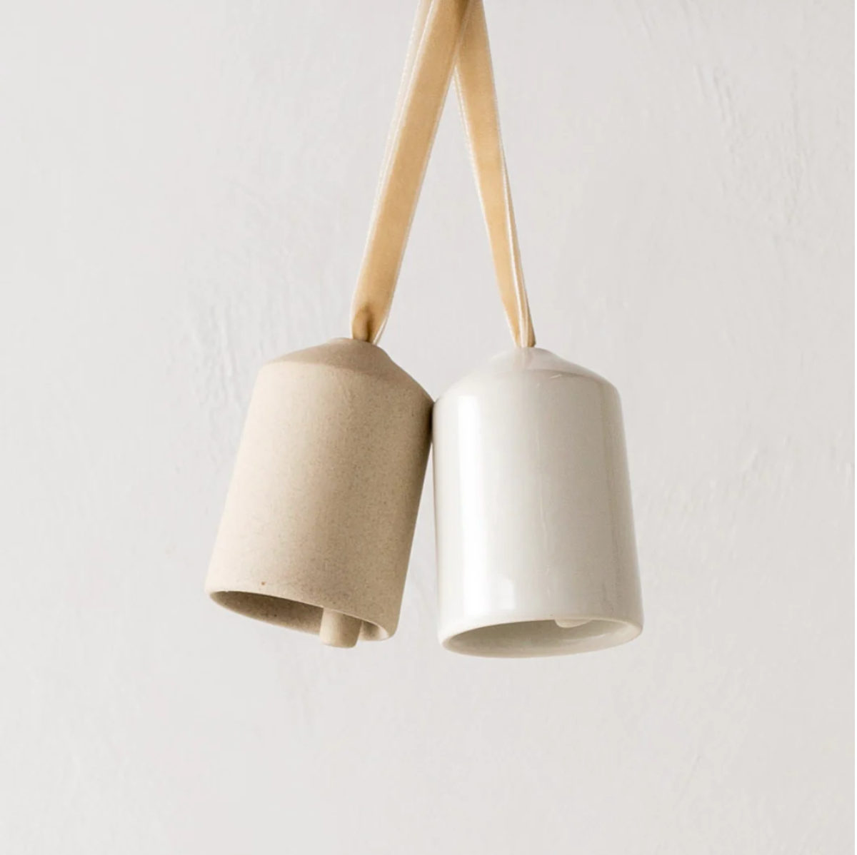 Ring in the holiday season with handmade ceramic bells. Each ornament is carefully crafted from one of our two clay bodies, ivory porcelain or raw stoneware, and finished with a cream velvet ribbon. Hang the ornaments around a christmas tree for a charming display or send a pair to a loved one for a gift that'll last years to come.