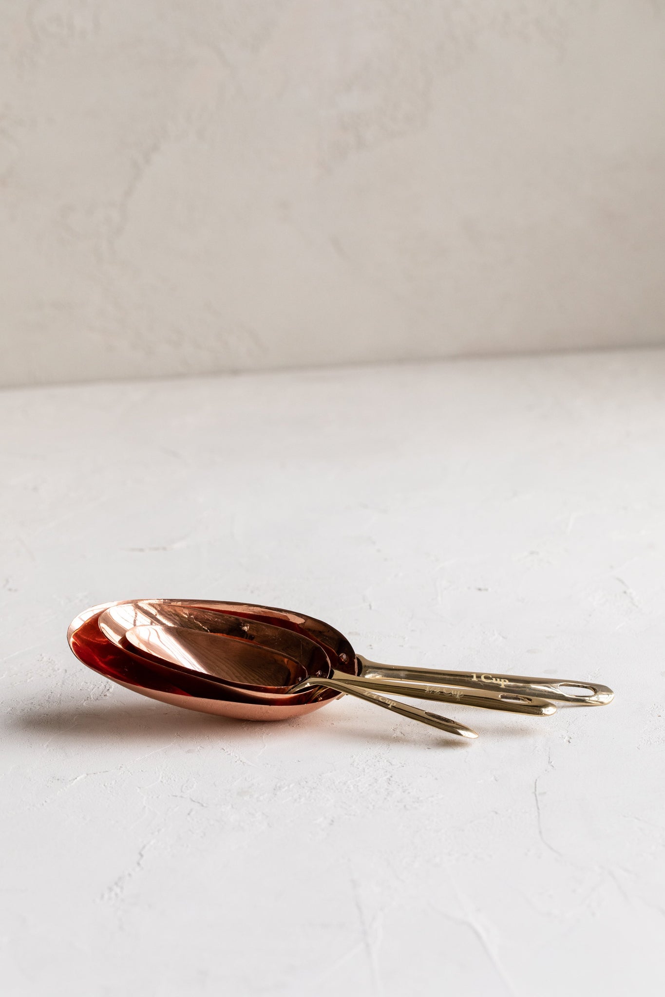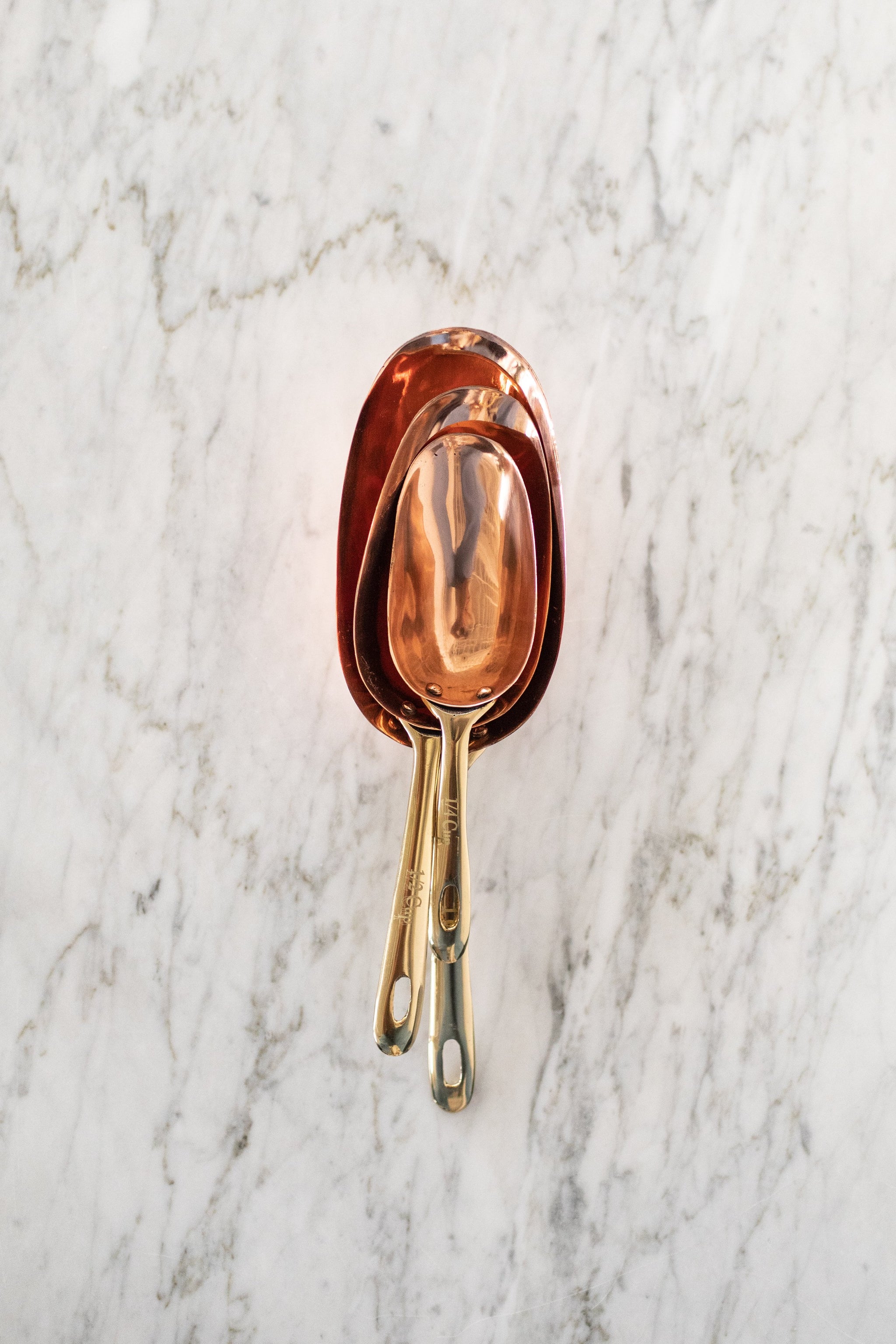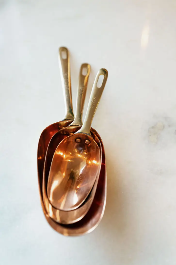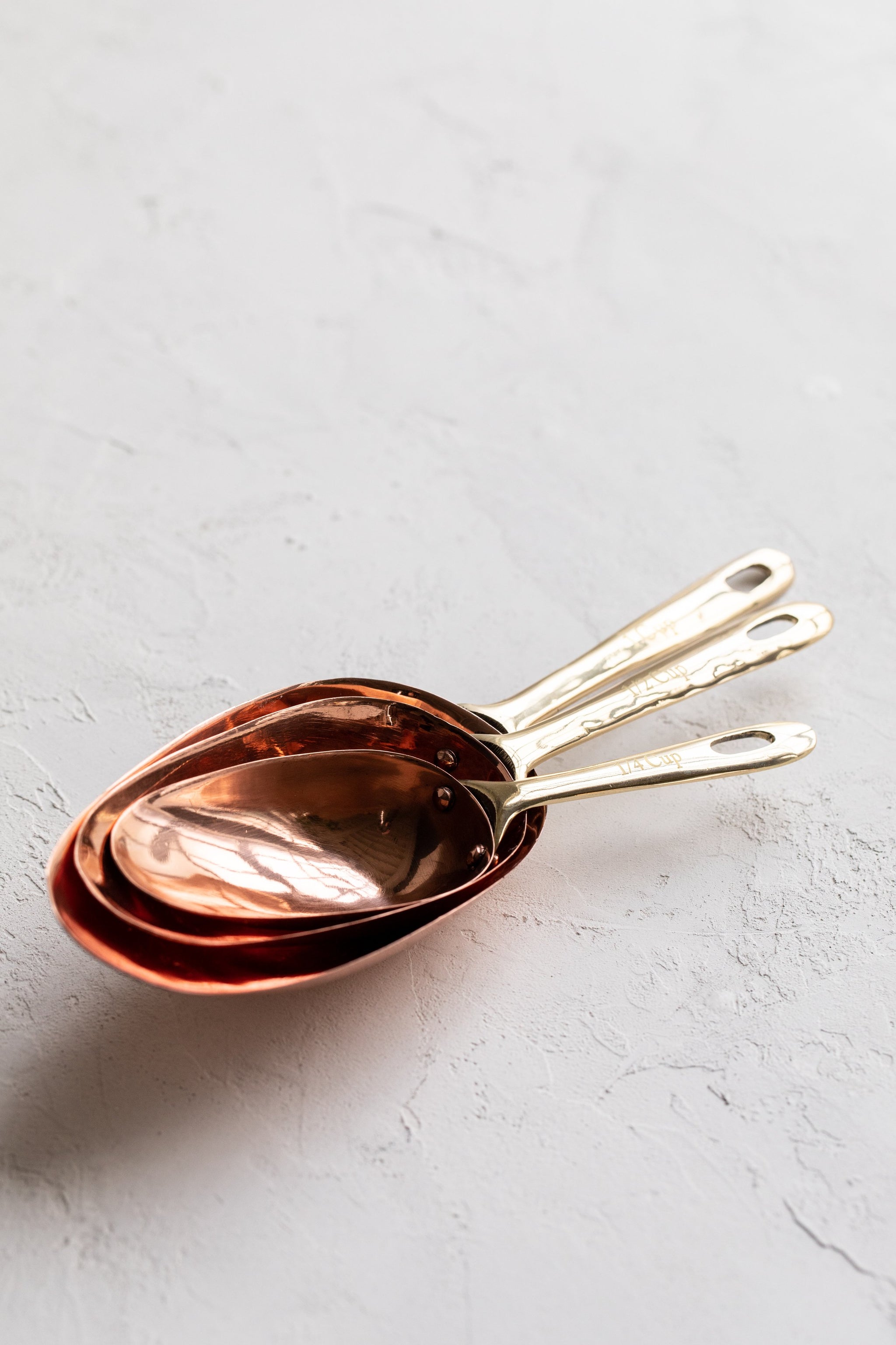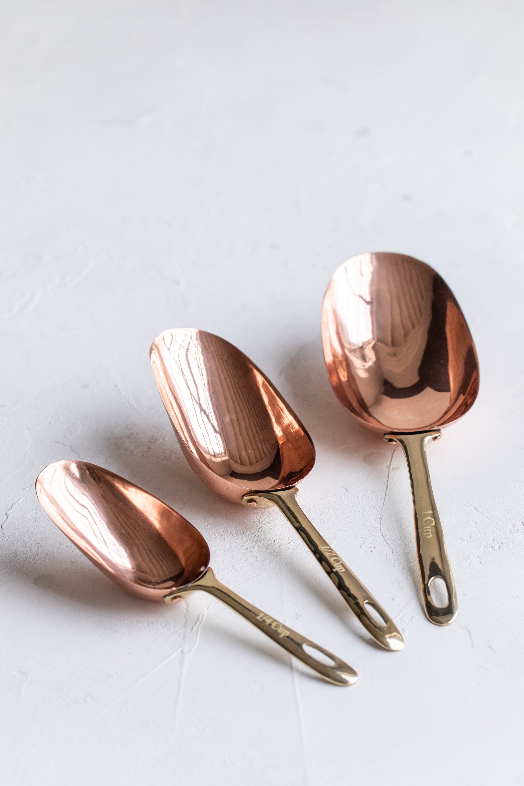 Copper Measuring Scoops add warmth and style to everyday cooking and baking. Beloved for their 100% pure copper scoop, easy-to-read measurements and brass handles, the set of 3 will make baking feel nostalgic. Includes 1/4 cup, 1/2 cup, and 1 cup. To get accurate measurement, do not scrape off top of scoop. It is a rounded scoop, so no scraping necessary.