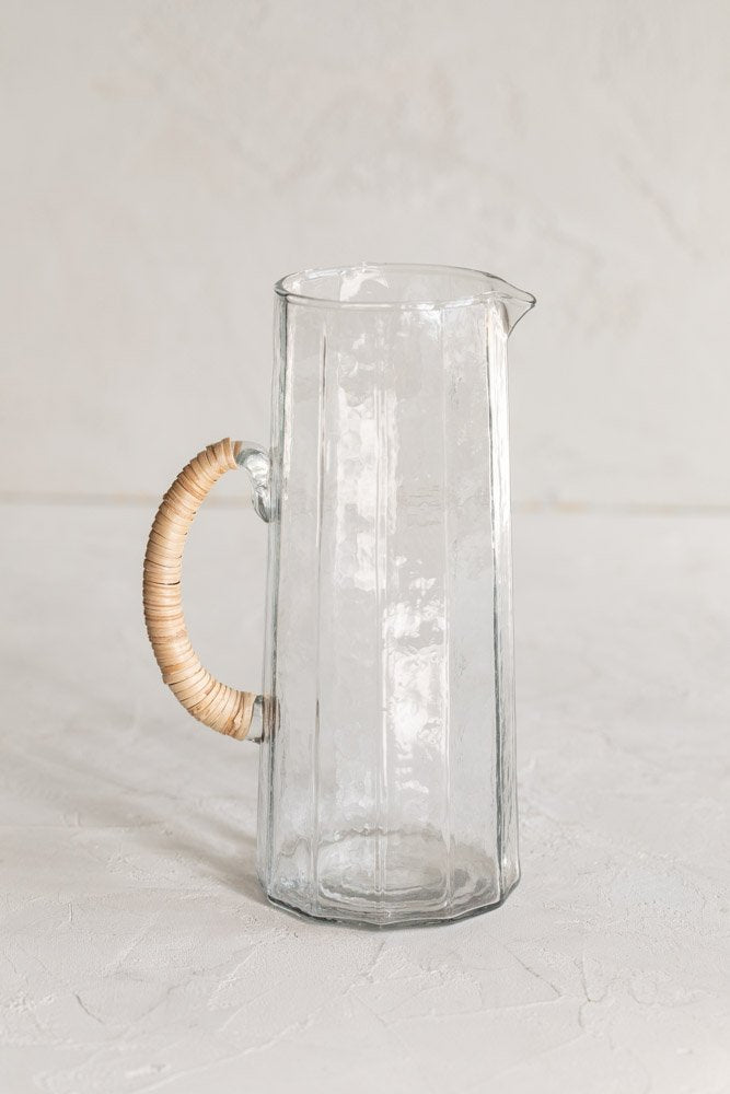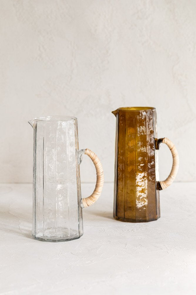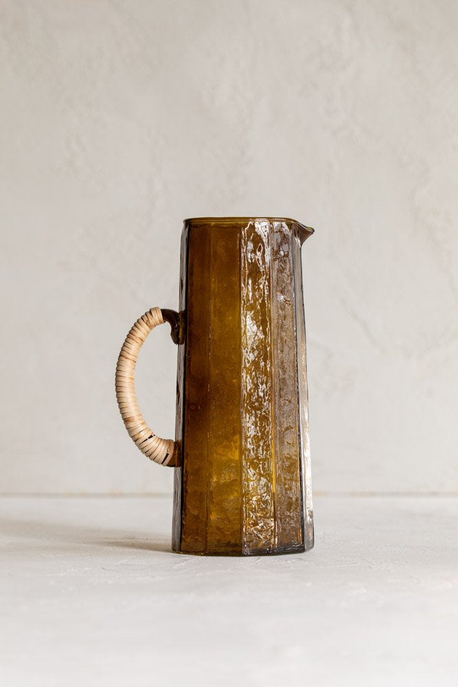 Crafted in Firozabad, India with artisanal precision, this handblown pitcher is made from high-quality, durable pot glass that is non-toxic. Its texture adds a unique raw touch to any table, while the distinct brown color brings a stylish accent to your basic drink ware. It also has a beautiful soft purple hue in sunlight. Perfect for both hot and cold beverages, this jug is strong and sturdy, making it a must-have for any home.