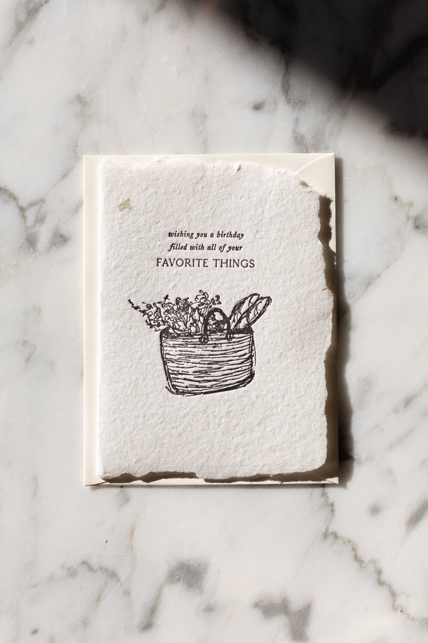 Card features a basket with baguettes and flowers and reads "wishing you a birthday filled with all of your favorite things".