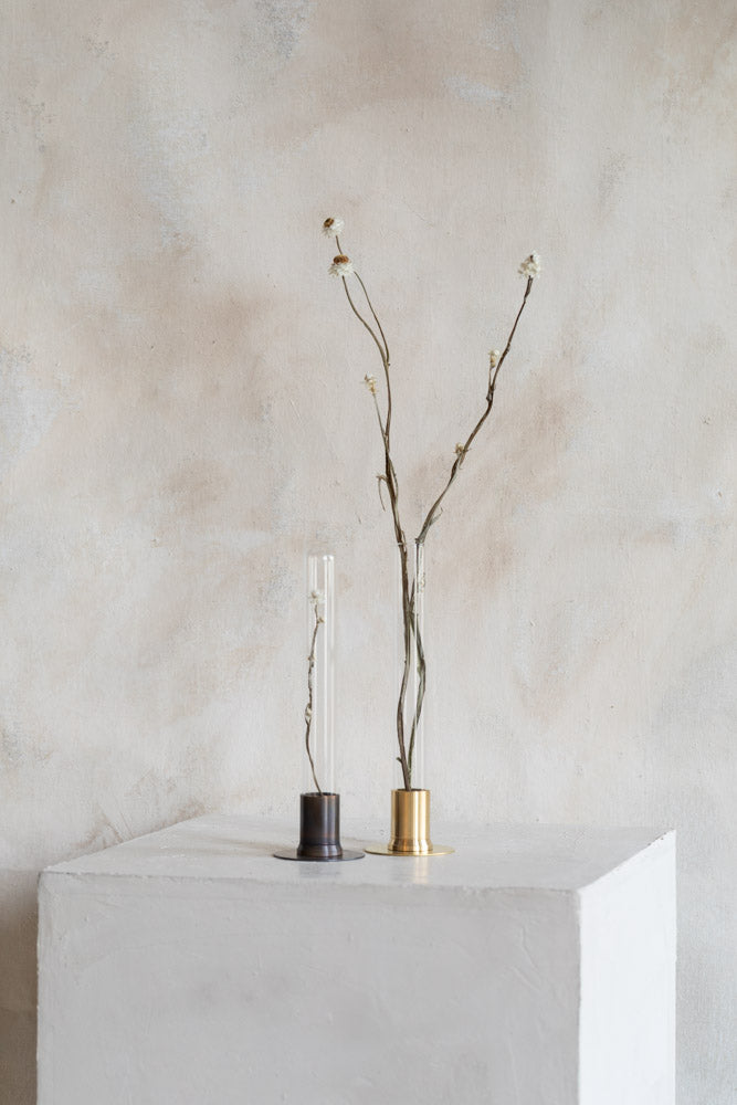 Rust Brass is achieved by submerging brass in a chemical solution to accelerate surface oxidation. The final appearance varies between pieces, with surface colors ranging from light brown to dark brown or blue-black, characterized by natural irregularities and variations in tone.