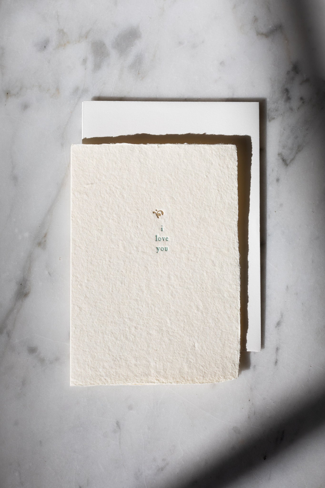 Some of our most-loved handmade paper cards, these small salutations are soft and poignant. with letterpress printed golden ornament and blue little words, they are as enjoyable to write in as they are to receive.
