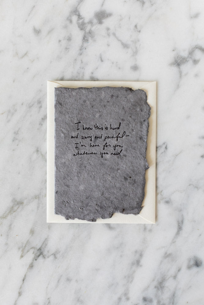 Night handmade paper with black letterpress reading "I know this is hard and scary and painful - I am here for you, whatever you need". Full deckle edge paper handmade in our California studio, hand-fed onto antique letterpresses for a textured deboss.