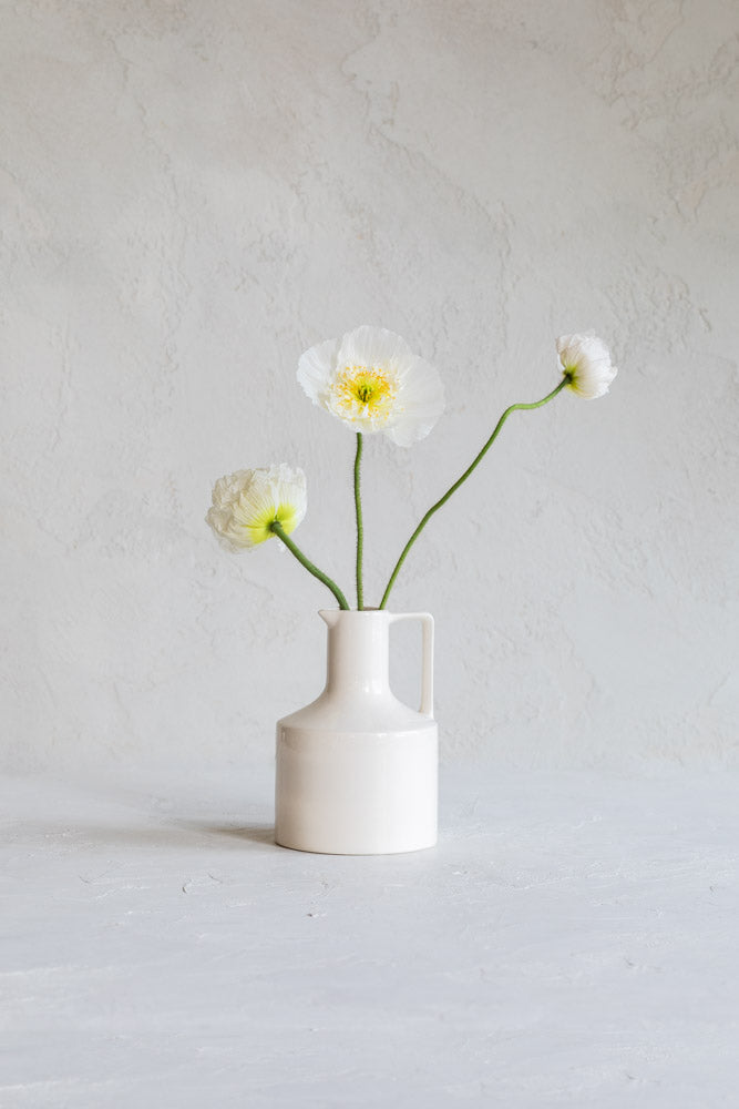 This stylish modern carafe may be used as a vase or pitcher. The semi-porcelain carafe with a glossy glaze evokes a retro look, while the straight-line handle gives the base a contemporary, Scandinavian aesthetic.