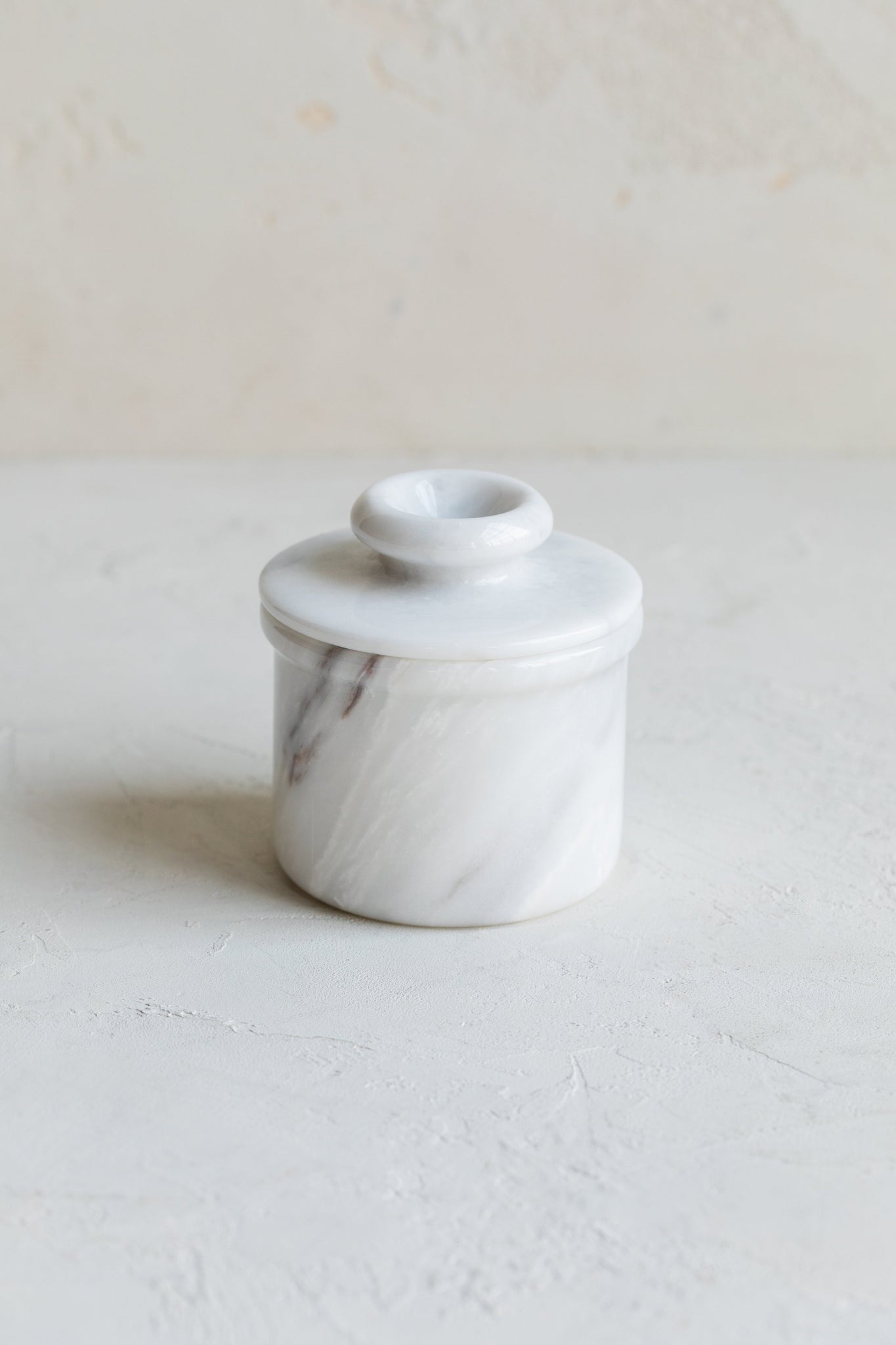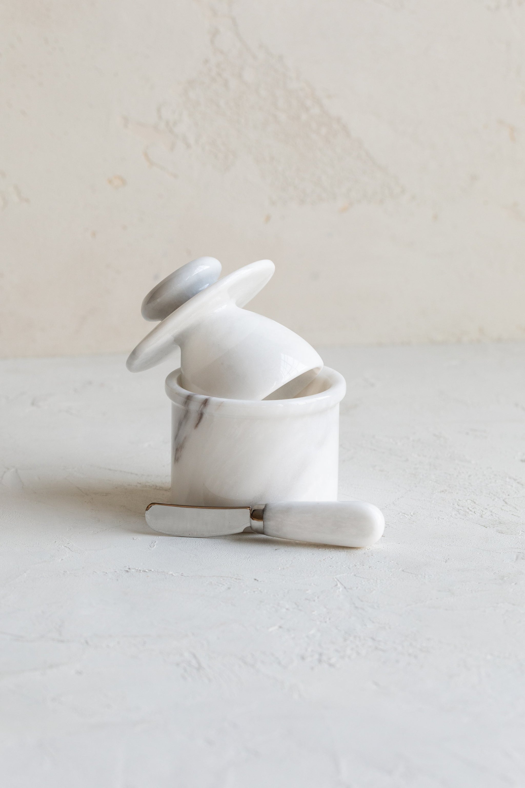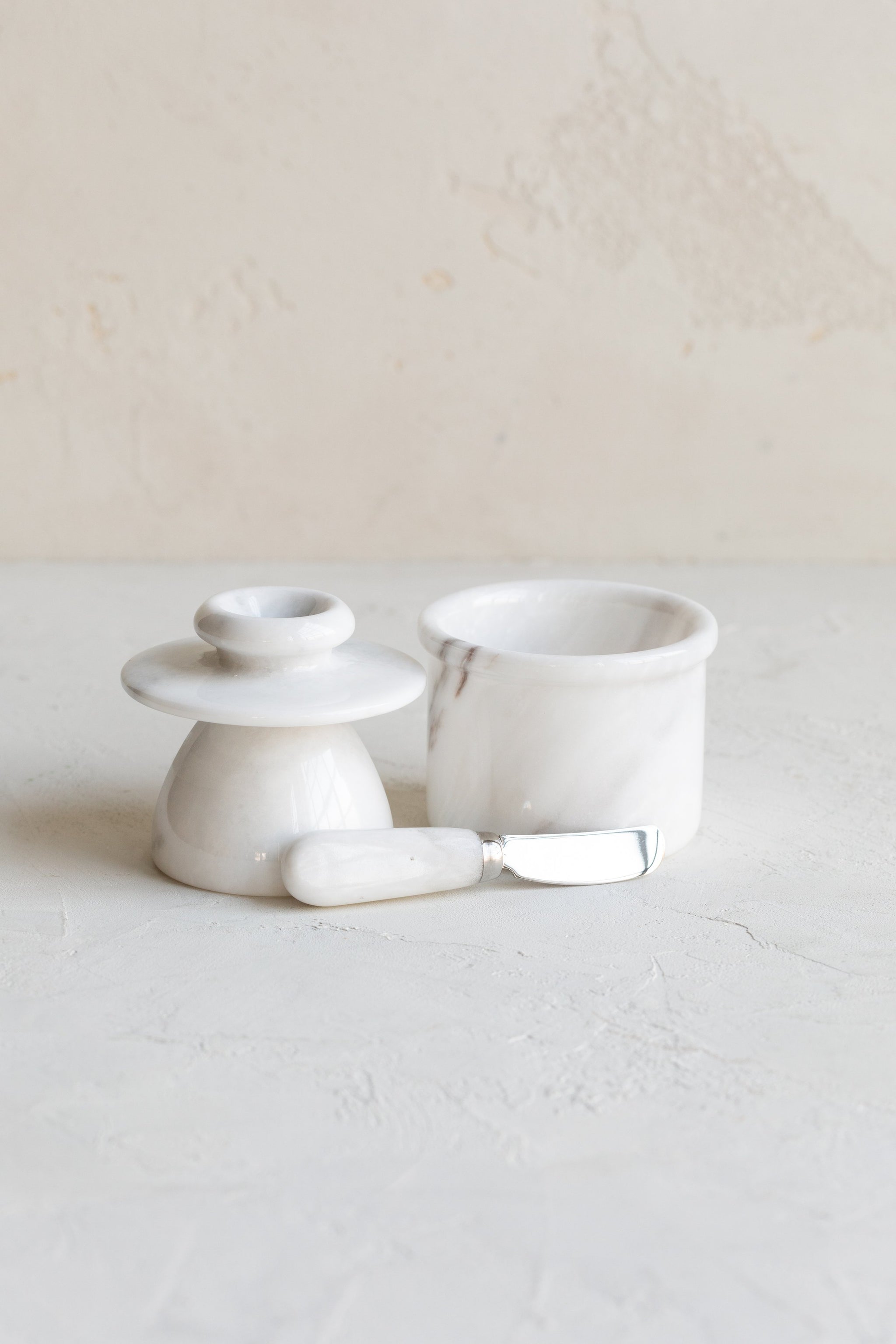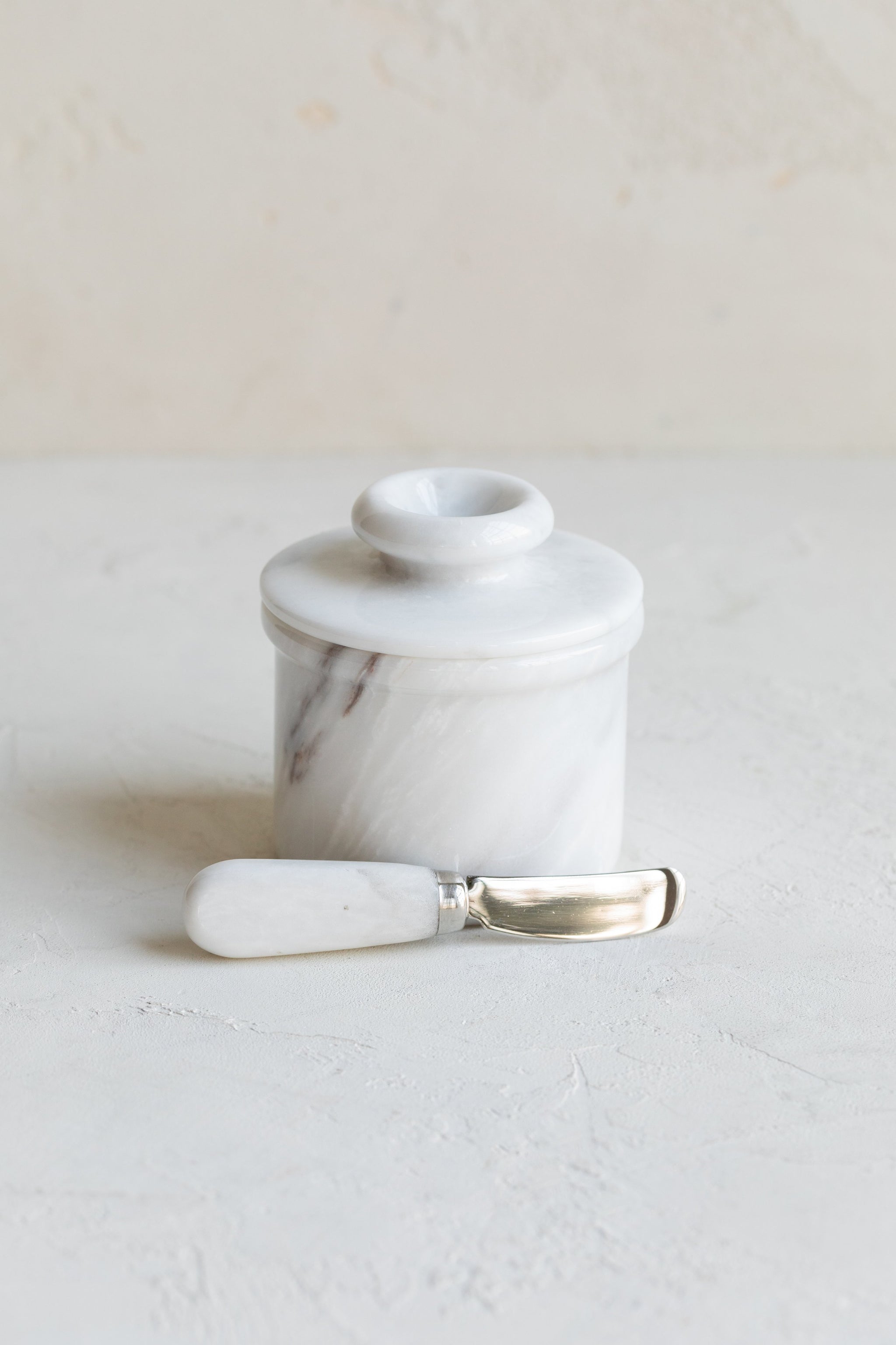 These handmade marble butter keepers are the ideal way to store butter on the counter. Place your butter into the inverted top where it will be shielded from oxygen and light, and add a little water into the base which will help create an airtight seal. This 17th-century French invention ensures that your butter will remain pathogen-free as it stays soft for easy spreading. A matching knife is included with the butter bell.