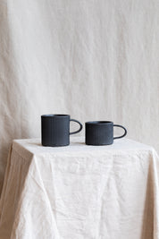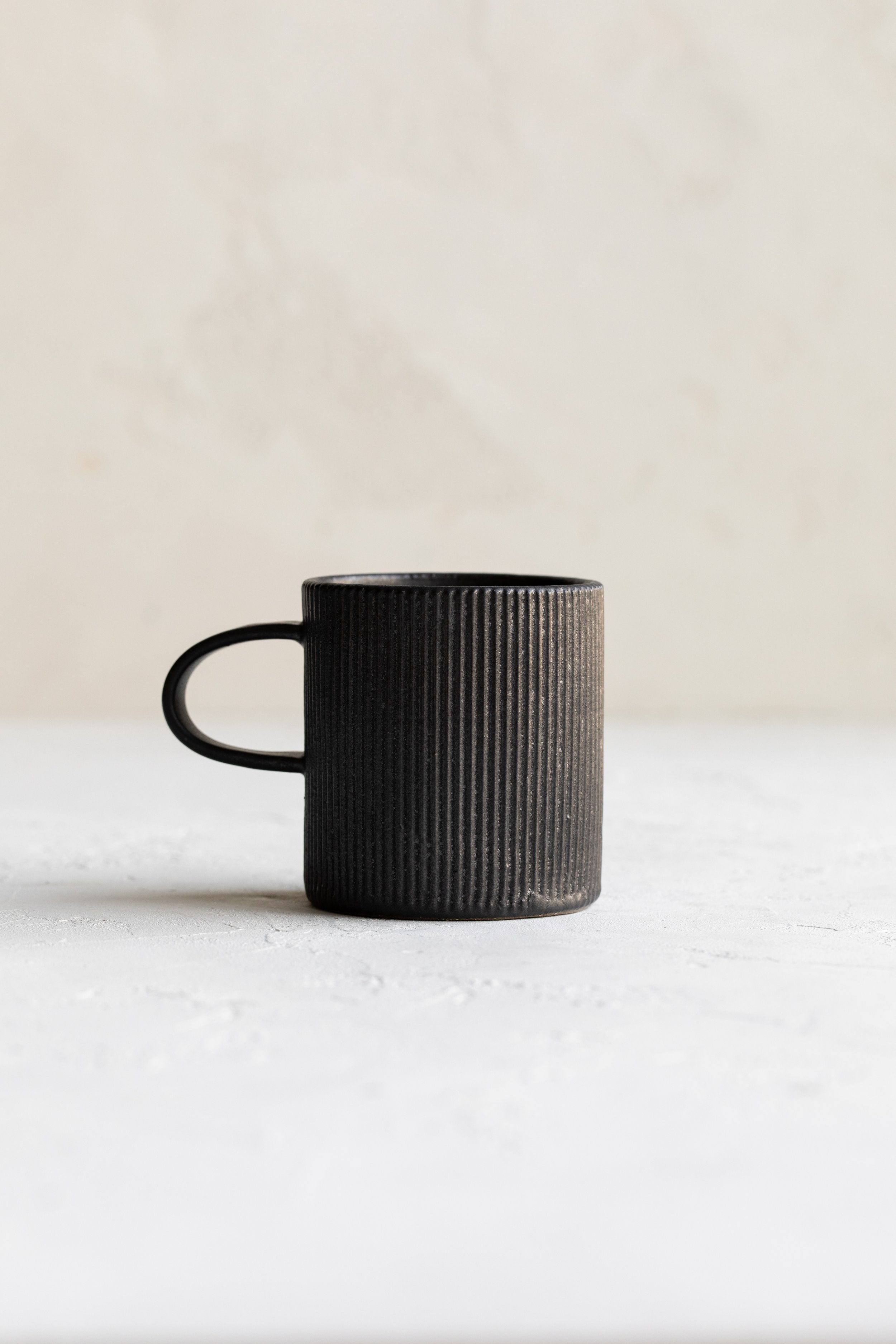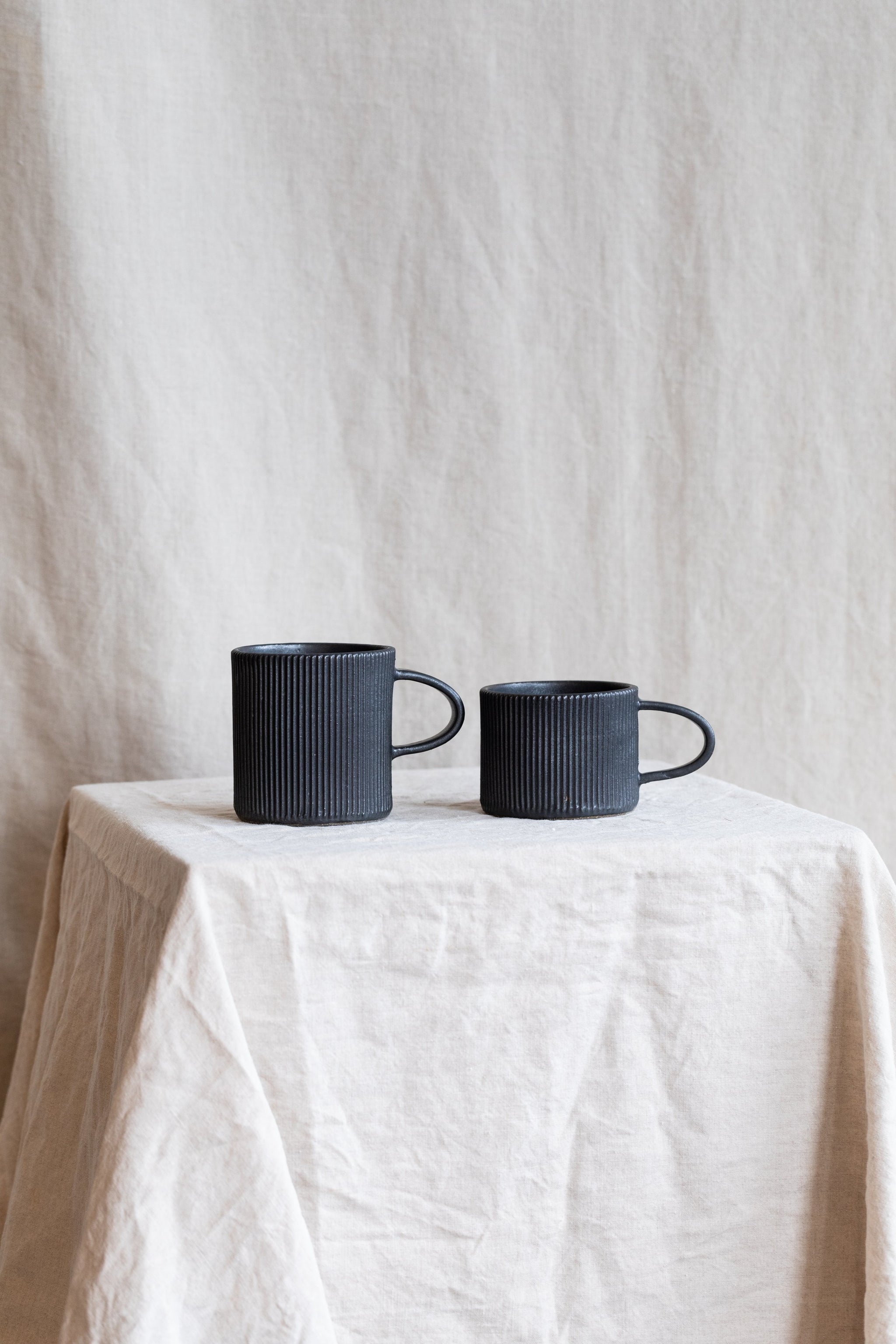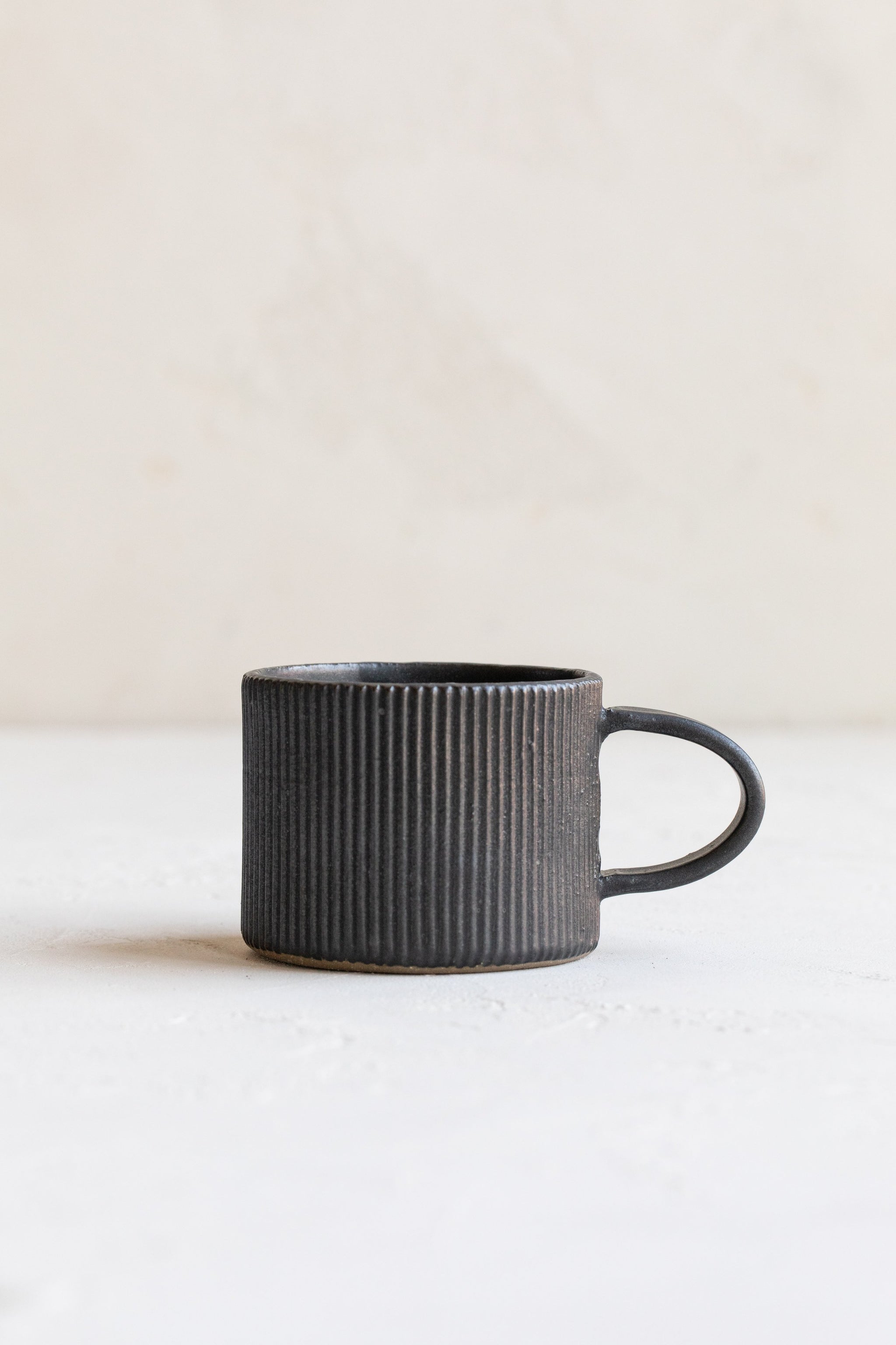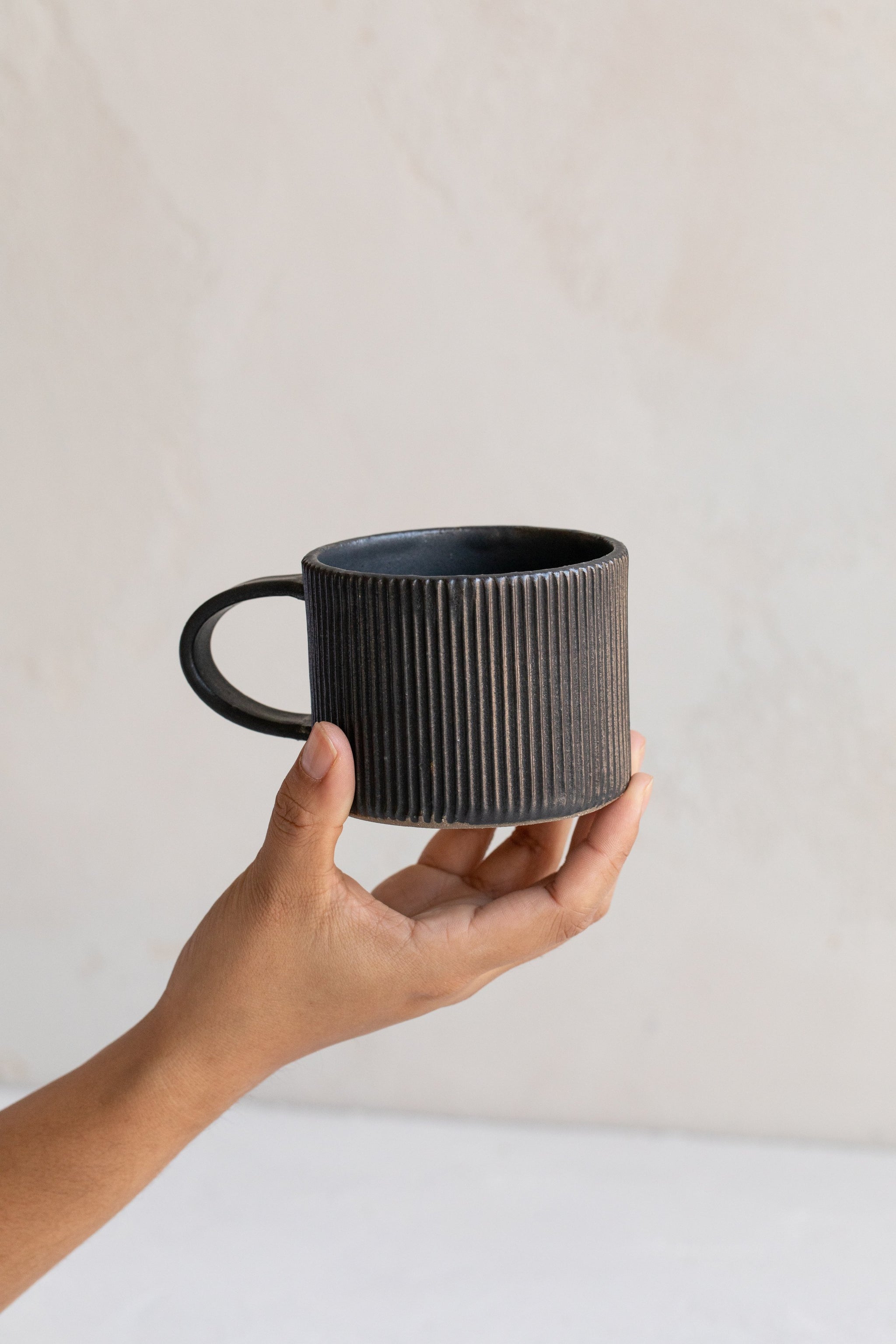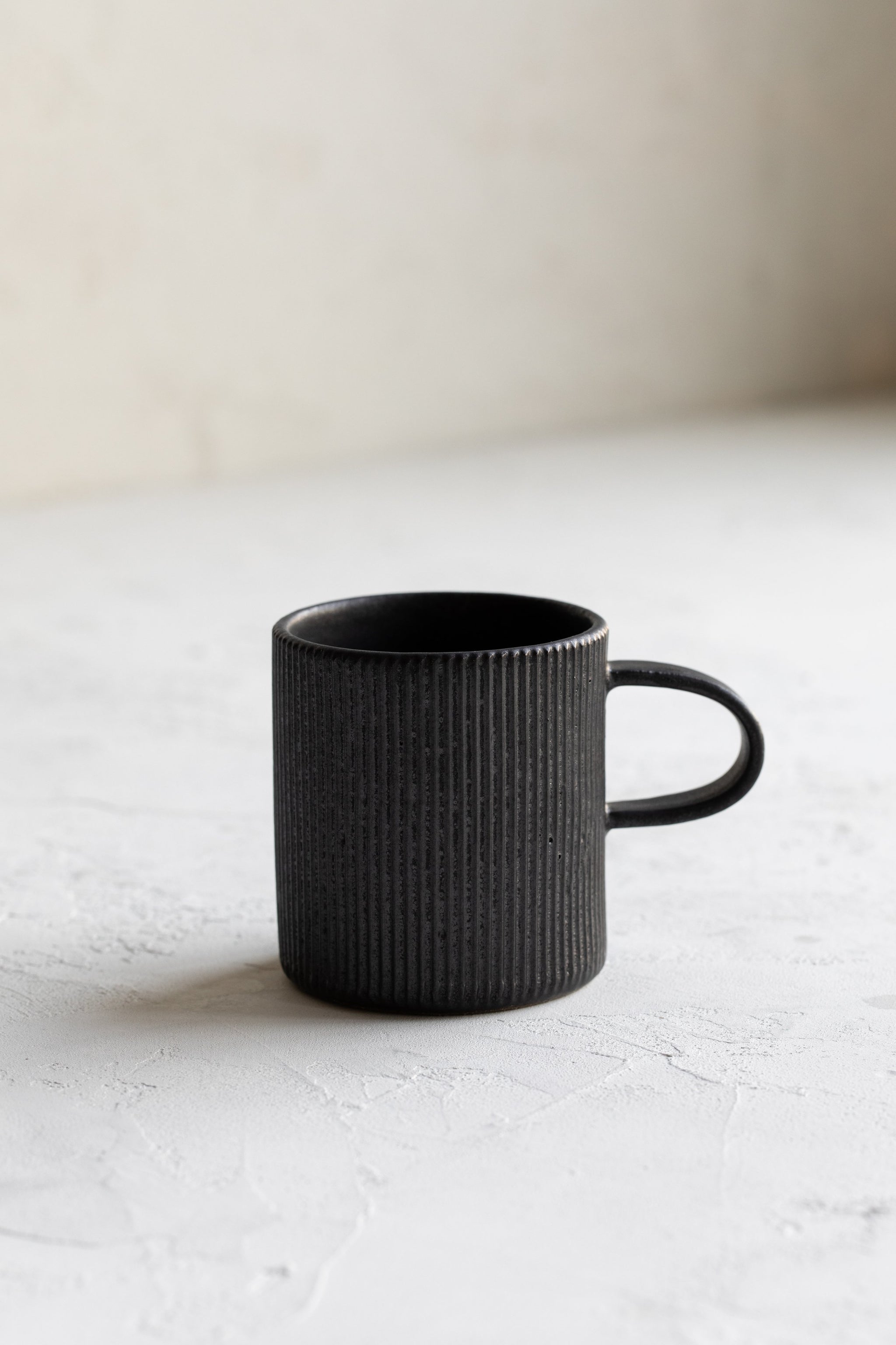 Make your morning tea and coffee ritual a little more exciting. These handmade mugs are decorated with a pattern of expressive lines and covered with shiny white glaze for an organic touch to your table.