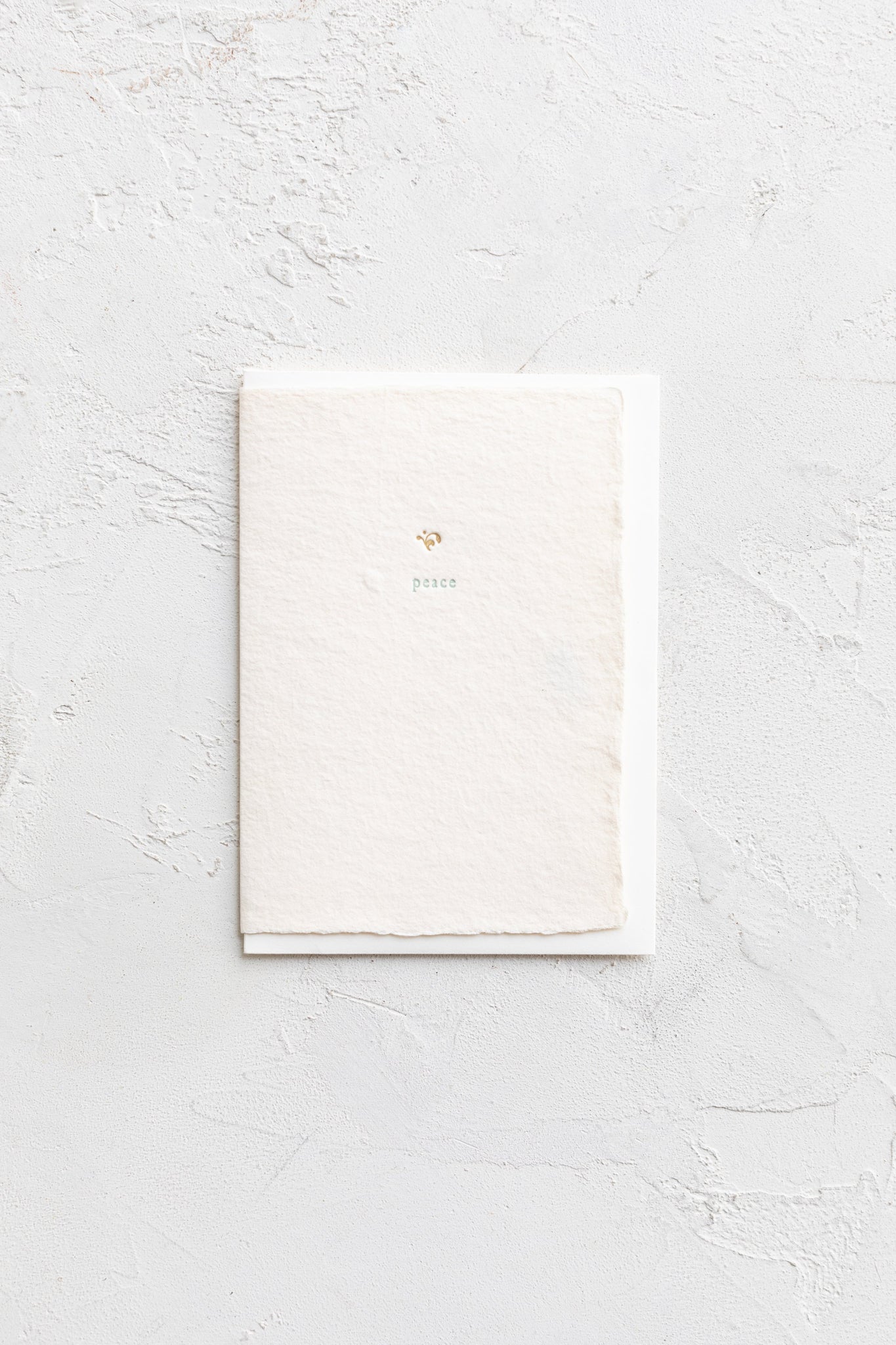 Some of our most-loved handmade paper cards, these small salutations are soft and poignant. with letterpress printed golden ornament and blue little words, they are as enjoyable to write in as they are to receive. peace - soy ink letterpress on full-deckle cream handmade recycled cotton paper
