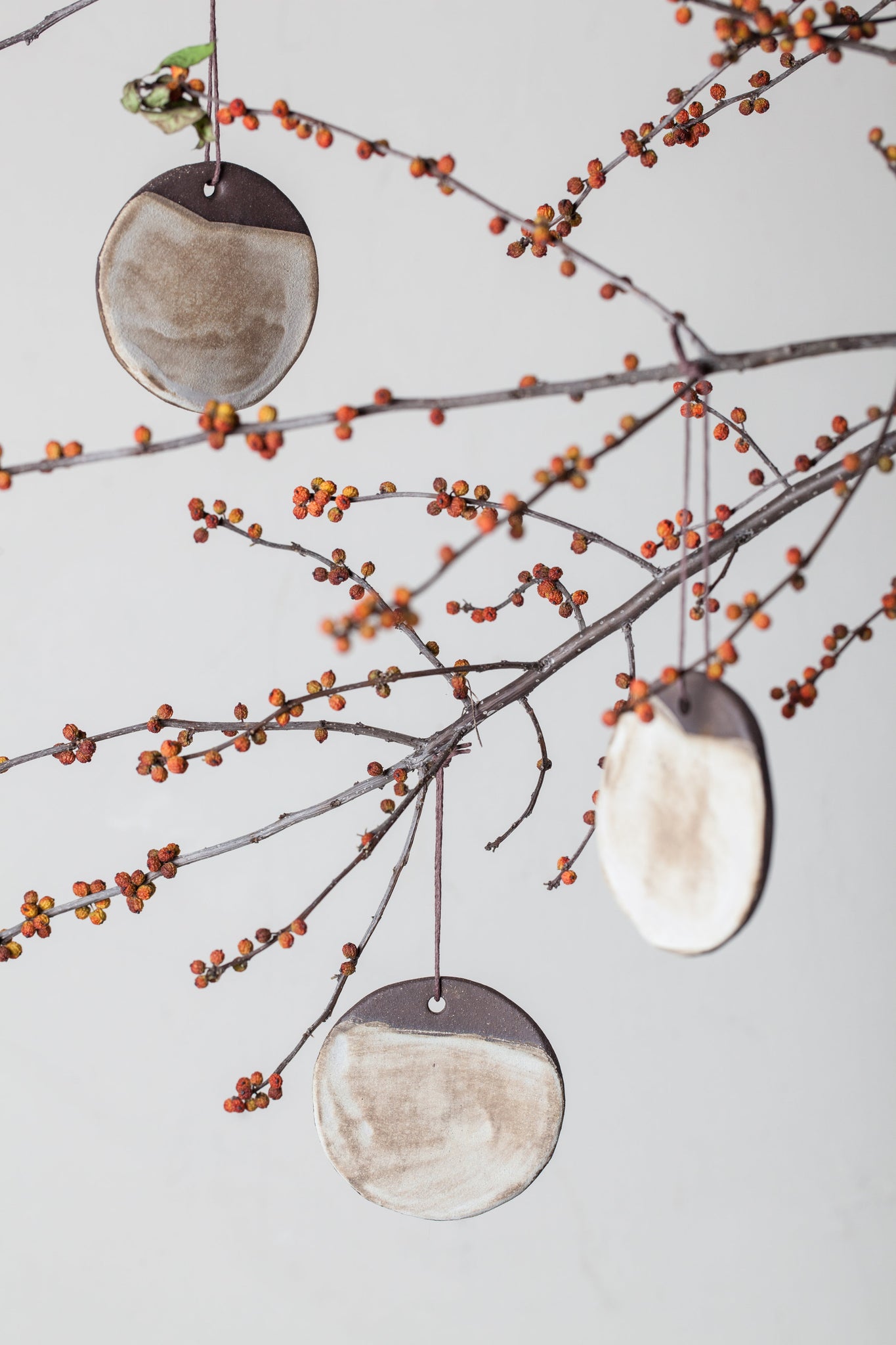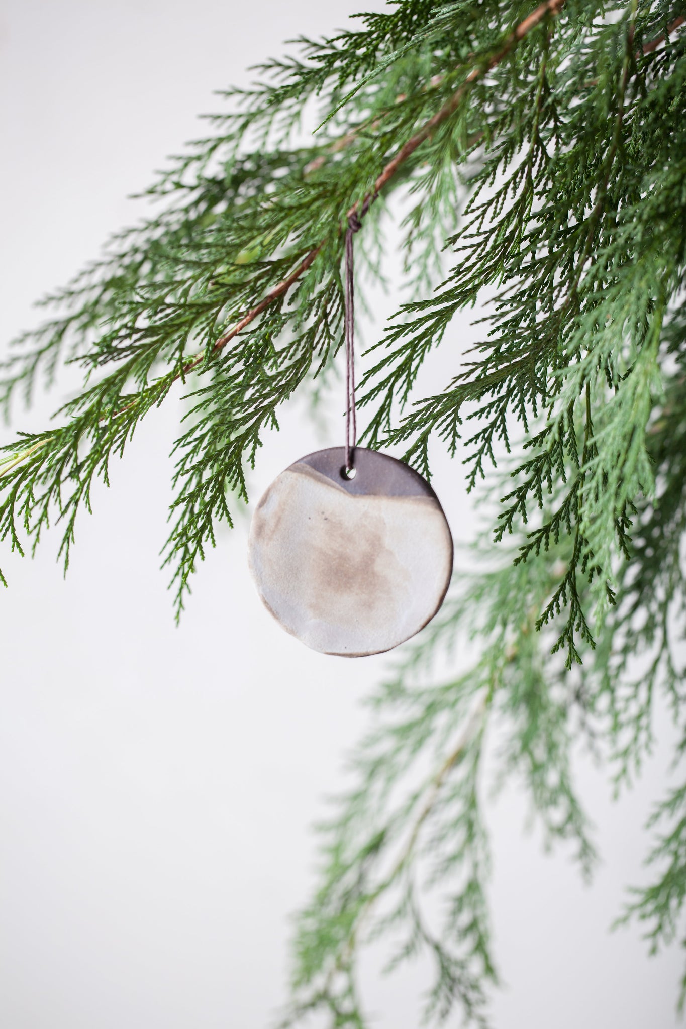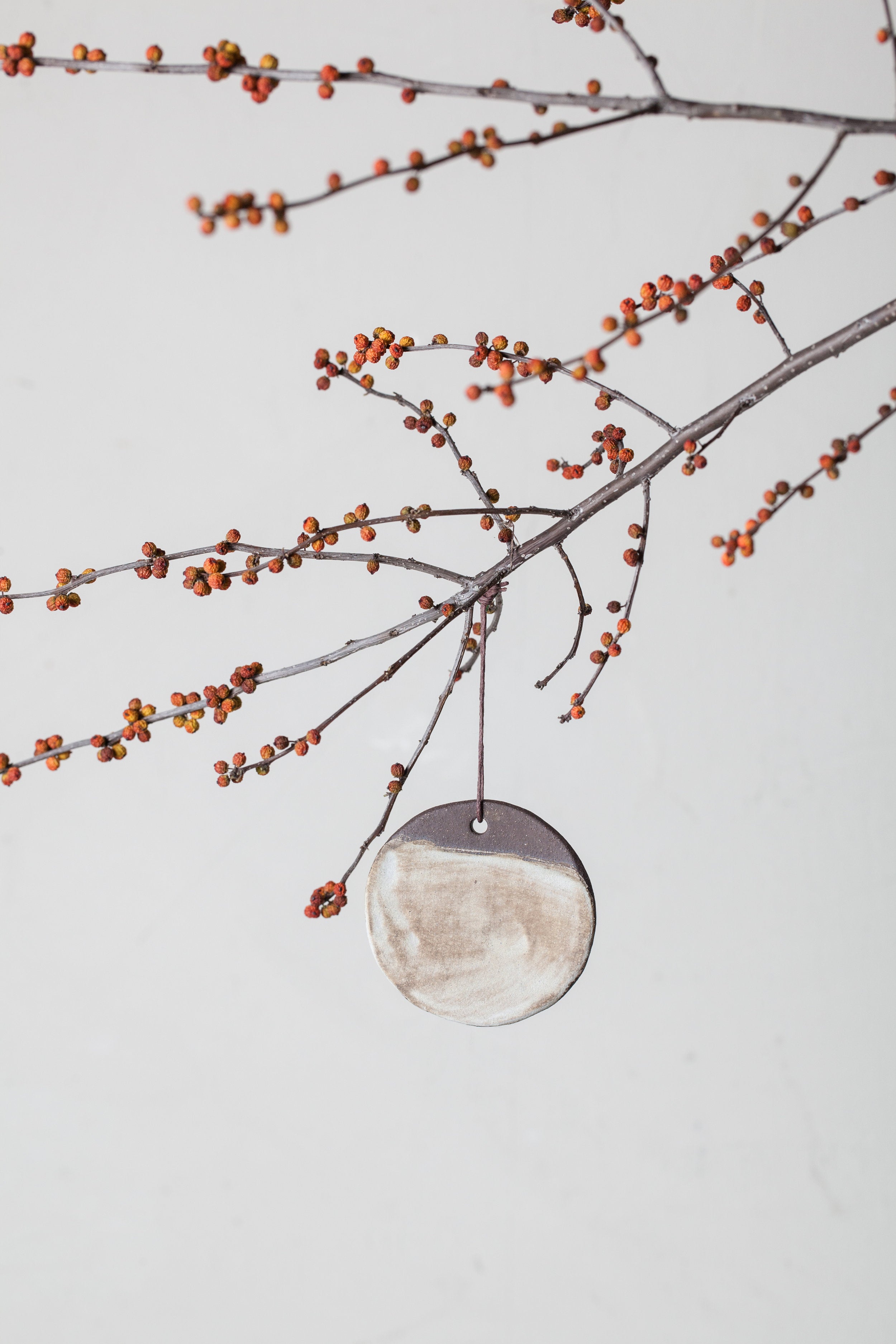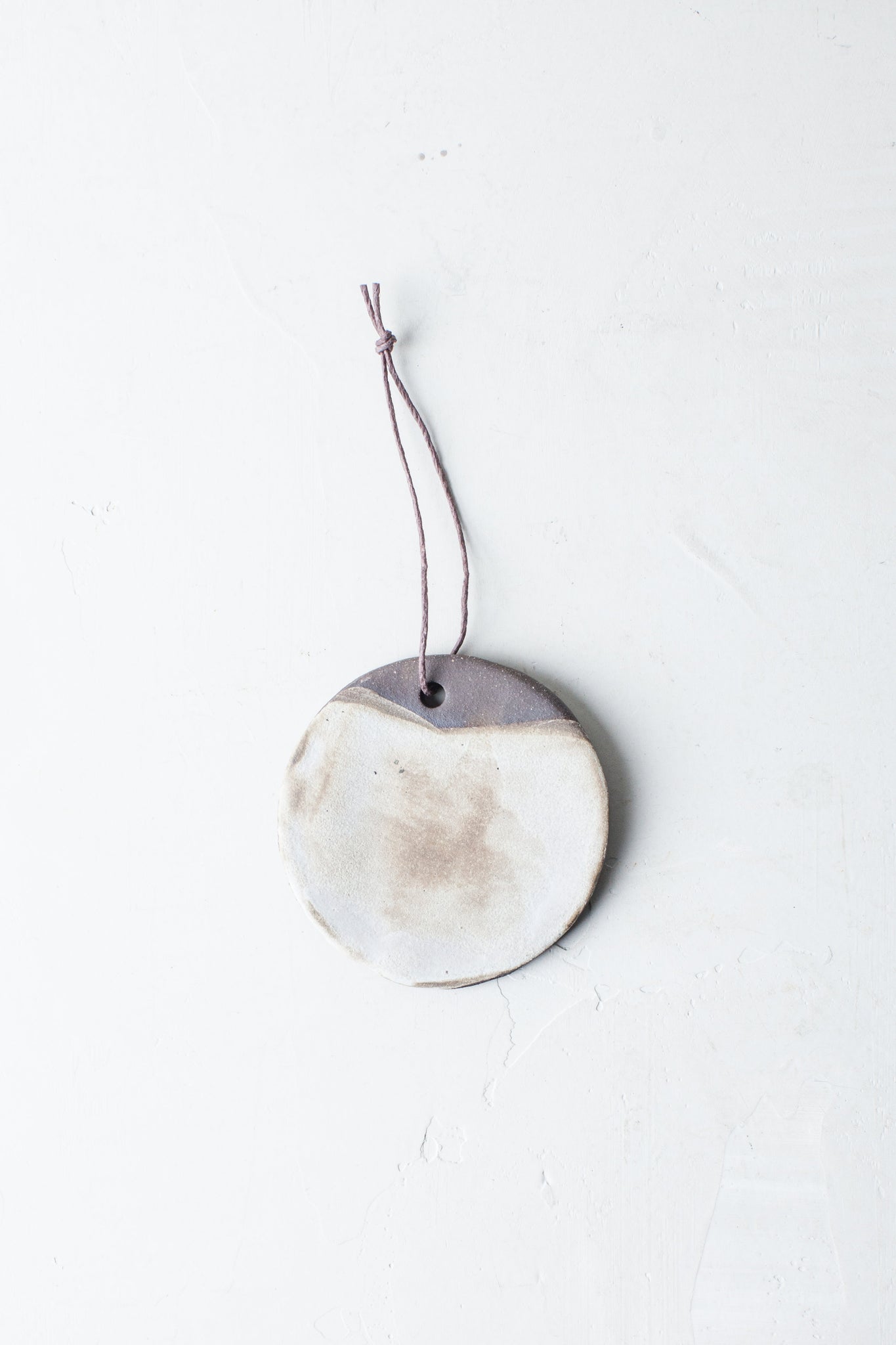 Handmade stoneware disc ornament by Notary ceramics in Portland, OR.